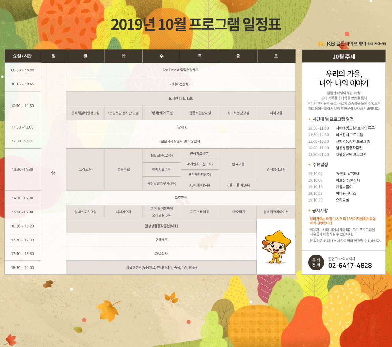 위례케어센터 [프로그램 안내] 2019년 위례케어센터 10월 프로그램 일정표 페이지 정보 작성자 KB 골든라이프 댓글 0건 조회 2,937회 작성일 19-10-03 14:07 목록 본문 목록 이전글[식단안내] 위례 빌리지 10월 2주차 식단표 19.10.04 다음글[프로그램 안내] 2019년 위례 빌리지 10월 프로그램 일정표 19.10.01