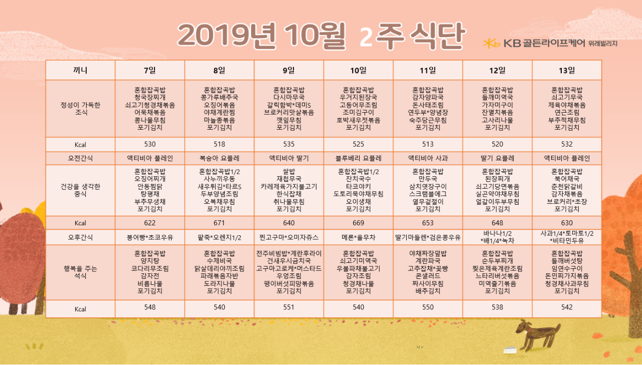위례빌리지 [식단안내] 위례 빌리지 10월 2주차 식단표 페이지 정보 작성자 KB 골든라이프 댓글 0건 조회 2,812회 작성일 19-10-04 11:12 목록 본문 목록 이전글[식단안내] 위례 데이케어 10월 2주차 식단표 19.10.04 다음글[프로그램 안내] 2019년 위례케어센터 10월 프로그램 일정표 19.10.03