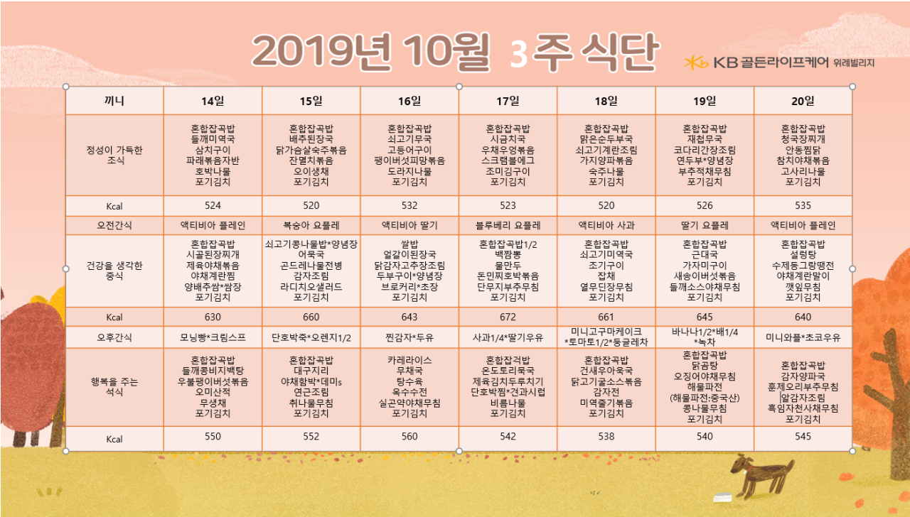 위례빌리지 [식단안내] 위례 빌리지 10월 3주차 식단표 페이지 정보 작성자 KB 골든라이프 댓글 0건 조회 3,038회 작성일 19-10-11 17:57 목록 본문 목록 이전글[식단안내] 위례 케어센터 10월 3주차 식단표 19.10.11 다음글[식단안내] 위례 데이케어 10월 2주차 식단표 19.10.04