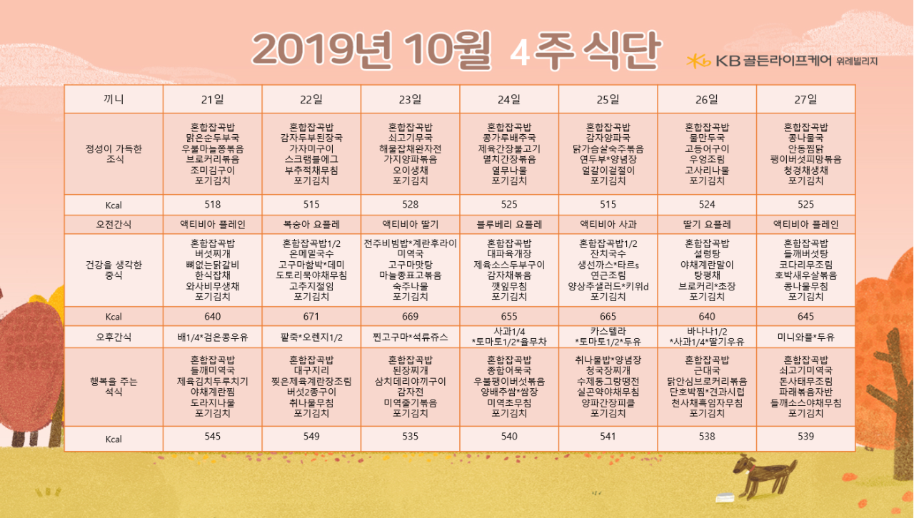 위례빌리지 [식단안내] 위례 빌리지 10월 4주차 식단표 페이지 정보 작성자 KB 골든라이프 댓글 0건 조회 2,545회 작성일 19-10-21 10:18 목록 본문 목록 이전글[식단안내] 위례 데이케어 10월 4주차 식단표 19.10.21 다음글[식단안내] 위례 케어센터 10월 3주차 식단표 19.10.11