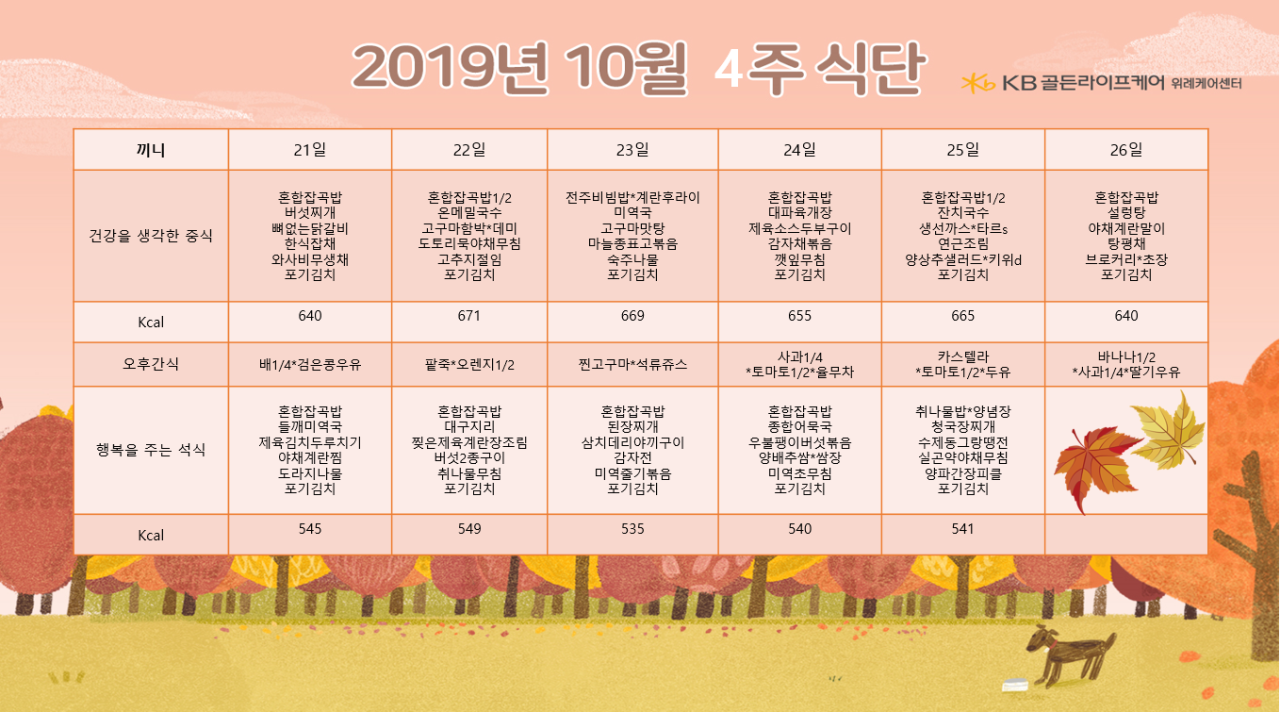 위례케어센터 [식단안내] 위례 데이케어 10월 4주차 식단표 페이지 정보 작성자 KB 골든라이프 댓글 0건 조회 2,863회 작성일 19-10-21 10:20 목록 본문 목록 이전글[식단안내] 위례 빌리지 10월 5주차 식단표 19.10.25 다음글[식단안내] 위례 빌리지 10월 4주차 식단표 19.10.21