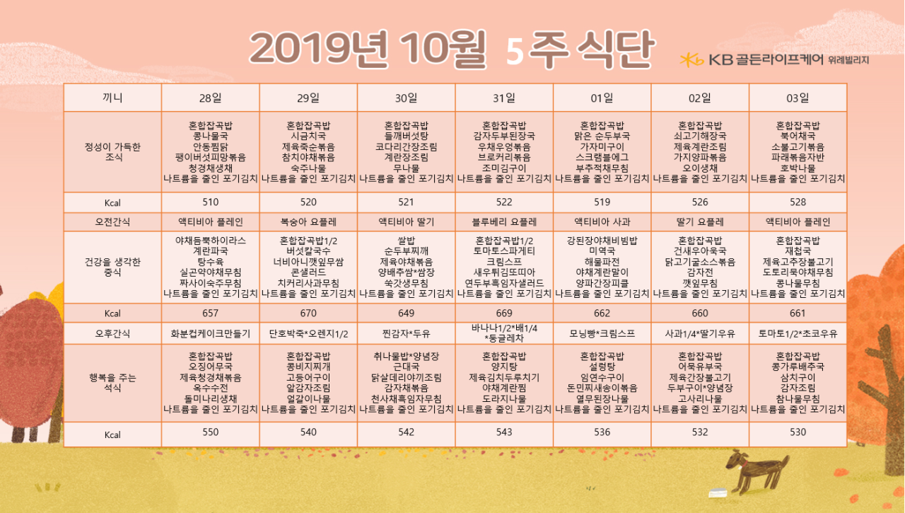 위례빌리지 [식단안내] 위례 빌리지 10월 5주차 식단표 페이지 정보 작성자 KB 골든라이프 댓글 0건 조회 2,623회 작성일 19-10-25 13:20 목록 본문 목록 이전글[식단안내] 위례 데이케어 10월 5주차 식단표 19.10.25 다음글[식단안내] 위례 데이케어 10월 4주차 식단표 19.10.21