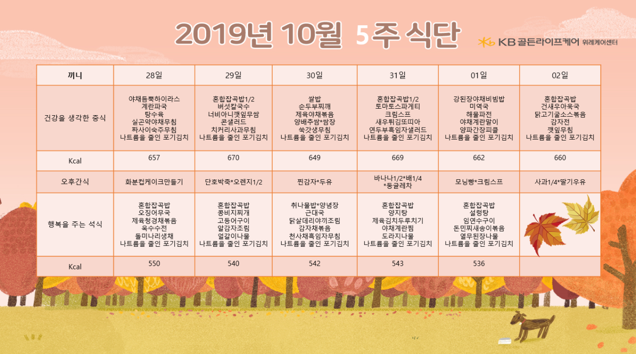 위례케어센터 [식단안내] 위례 데이케어 10월 5주차 식단표 페이지 정보 작성자 KB 골든라이프 댓글 0건 조회 2,601회 작성일 19-10-25 13:21 목록 본문 목록 이전글[KB골든라이프케어 위례 빌리지] 기관견학 신청안내 19.10.28 다음글[식단안내] 위례 빌리지 10월 5주차 식단표 19.10.25
