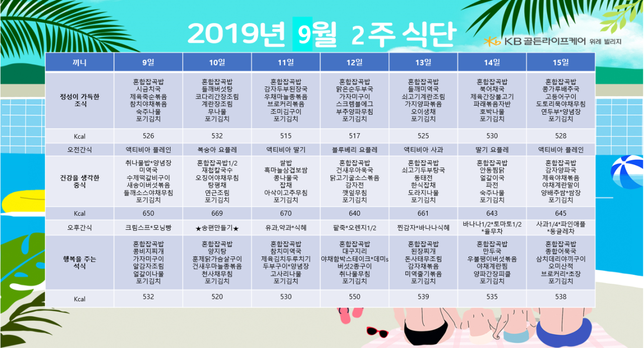 위례빌리지 [식단안내] 위례 빌리지 9월 2주차 식단표 페이지 정보 작성자 KB 골든라이프 댓글 0건 조회 2,254회 작성일 19-09-06 19:18 목록 본문 목록 이전글[식단안내] 위례 데이케어 9월 2주차 식단표 19.09.06 다음글[프로그램 안내] 2019년 위례빌리지 9월 프로그램 일정표 19.09.03