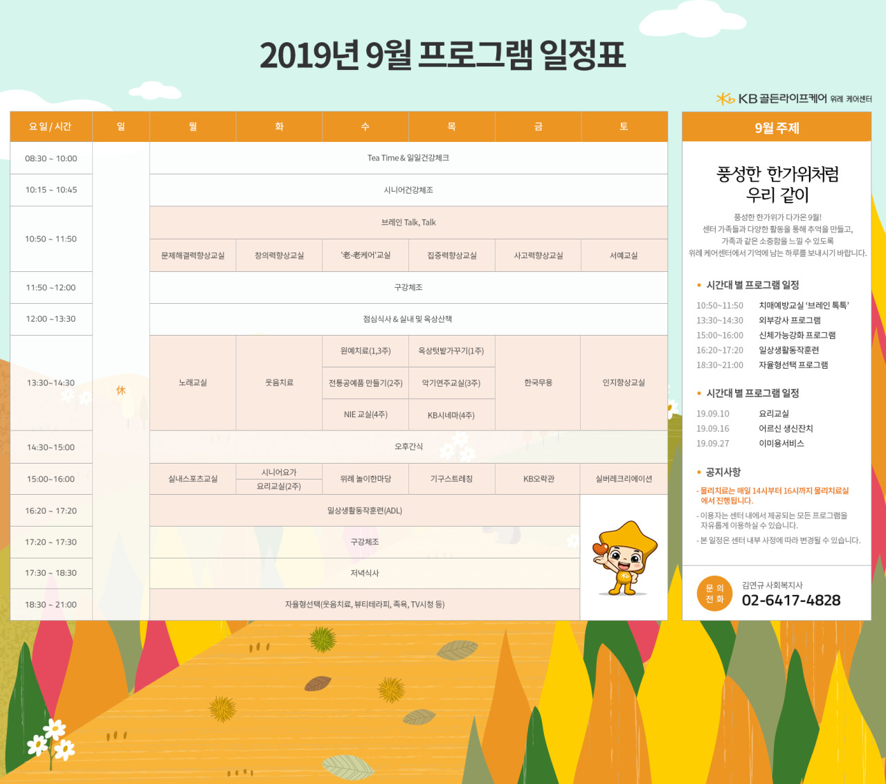위례케어센터 [프로그램 안내] 2019년 위례케어센터 9월 프로그램 일정표 페이지 정보 작성자 KB 골든라이프 댓글 0건 조회 2,866회 작성일 19-09-09 18:34 목록 본문 목록 이전글[식단안내] 위례 데이케어 9월 3주차 식단표 19.09.13 다음글[식단안내] 위례 데이케어 9월 2주차 식단표 19.09.06