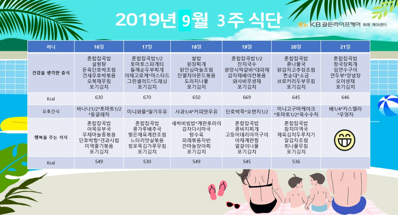 위례케어센터 [식단안내] 위례 데이케어 9월 3주차 식단표 페이지 정보 작성자 KB 골든라이프 댓글 0건 조회 2,686회 작성일 19-09-13 16:37 목록 본문 목록 이전글[식단안내] 위례 빌리지 9월 3주차 식단표 19.09.13 다음글[프로그램 안내] 2019년 위례케어센터 9월 프로그램 일정표 19.09.09