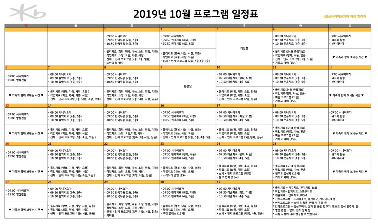위례빌리지 [프로그램 안내] 2019년 위례 빌리지 10월 프로그램 일정표 페이지 정보 작성자 KB 골든라이프 댓글 0건 조회 2,914회 작성일 19-10-01 17:38 목록 본문 목록 이전글[프로그램 안내] 2019년 위례케어센터 10월 프로그램 일정표 19.10.03 다음글[식단안내] 강동케어센터 2019년 10월 식단표 19.09.30