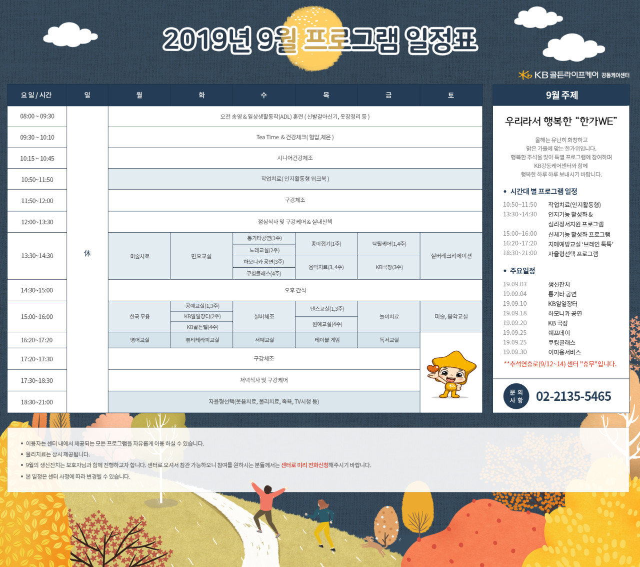 강동케어센터 [프로그램 안내] 2019년 강동케어센터 9월 프로그램 일정표 페이지 정보 작성자 KB 골든라이프 댓글 0건 조회 2,761회 작성일 19-08-26 15:41 목록 본문 목록 이전글[식단안내] 강동케어센터 2019년 9월 식단표 19.08.26 다음글[식단안내] 위례 케어센터 8월 5주차 식단표 19.08.23