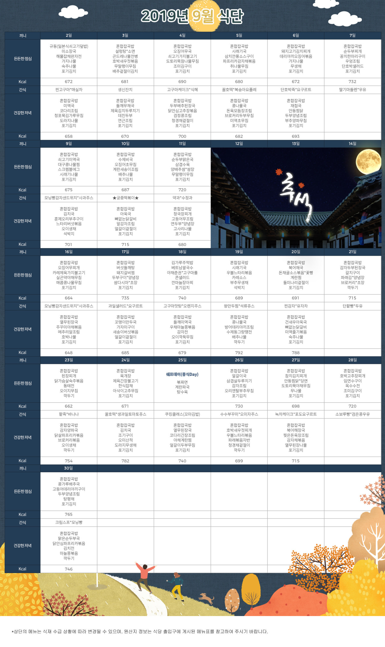 강동케어센터 [식단안내] 강동케어센터 2019년 9월 식단표 페이지 정보 작성자 KB 골든라이프 댓글 0건 조회 3,038회 작성일 19-08-26 15:42 목록 본문 목록 이전글[식단안내] 위례 빌리지 9월 1주차 식단표 19.08.30 다음글[프로그램 안내] 2019년 강동케어센터 9월 프로그램 일정표 19.08.26
