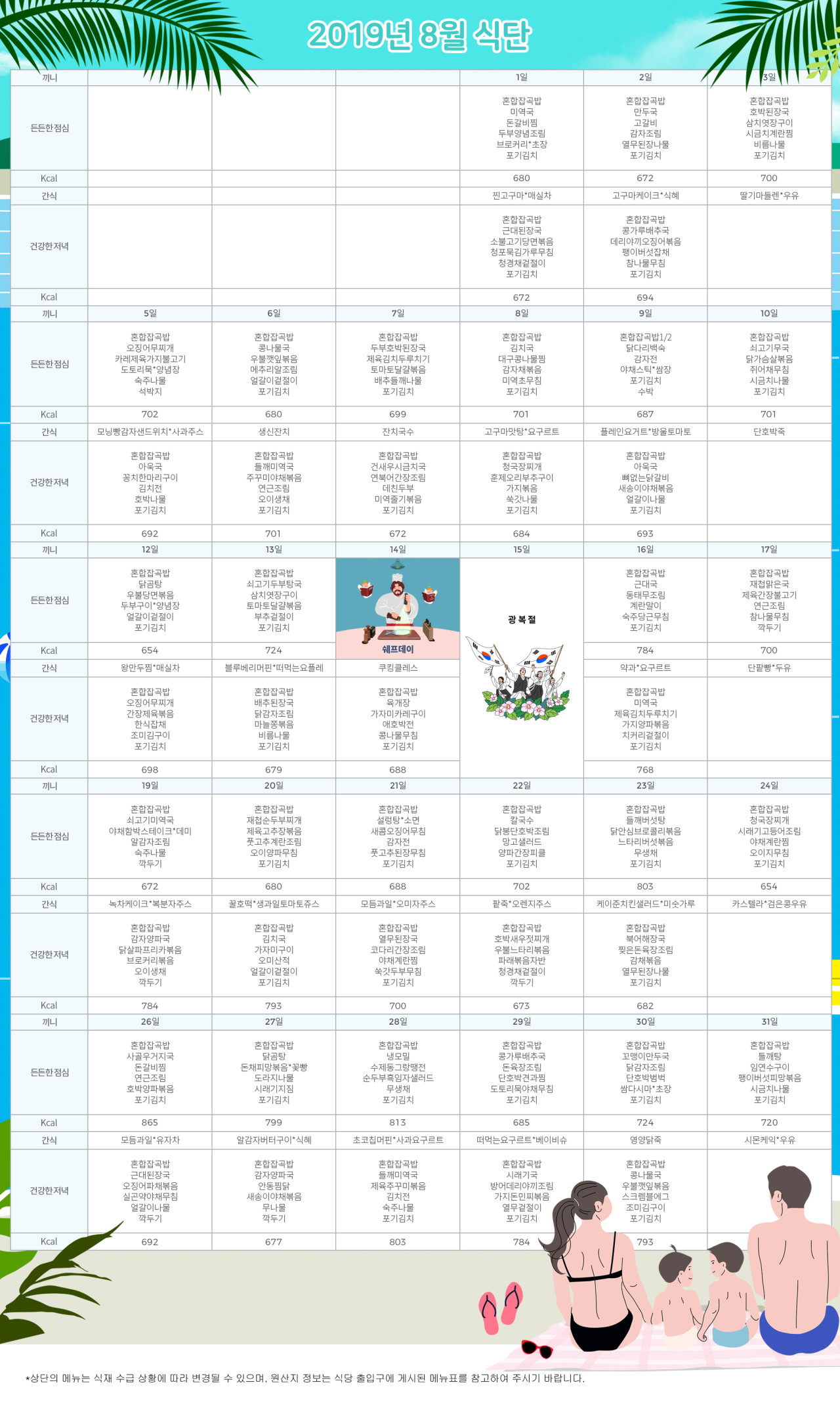 강동케어센터 [식단안내] 강동케어센터 2019년 8월 식단표 페이지 정보 작성자 KB 골든라이프 댓글 0건 조회 2,594회 작성일 19-07-26 15:39 목록 본문 목록 이전글[프로그램 안내] 2019년 강동케어센터 8월 프로그램 스케줄 19.07.26 다음글[식단안내] 위례케어센터 7월 5주차 식단표 19.07.26