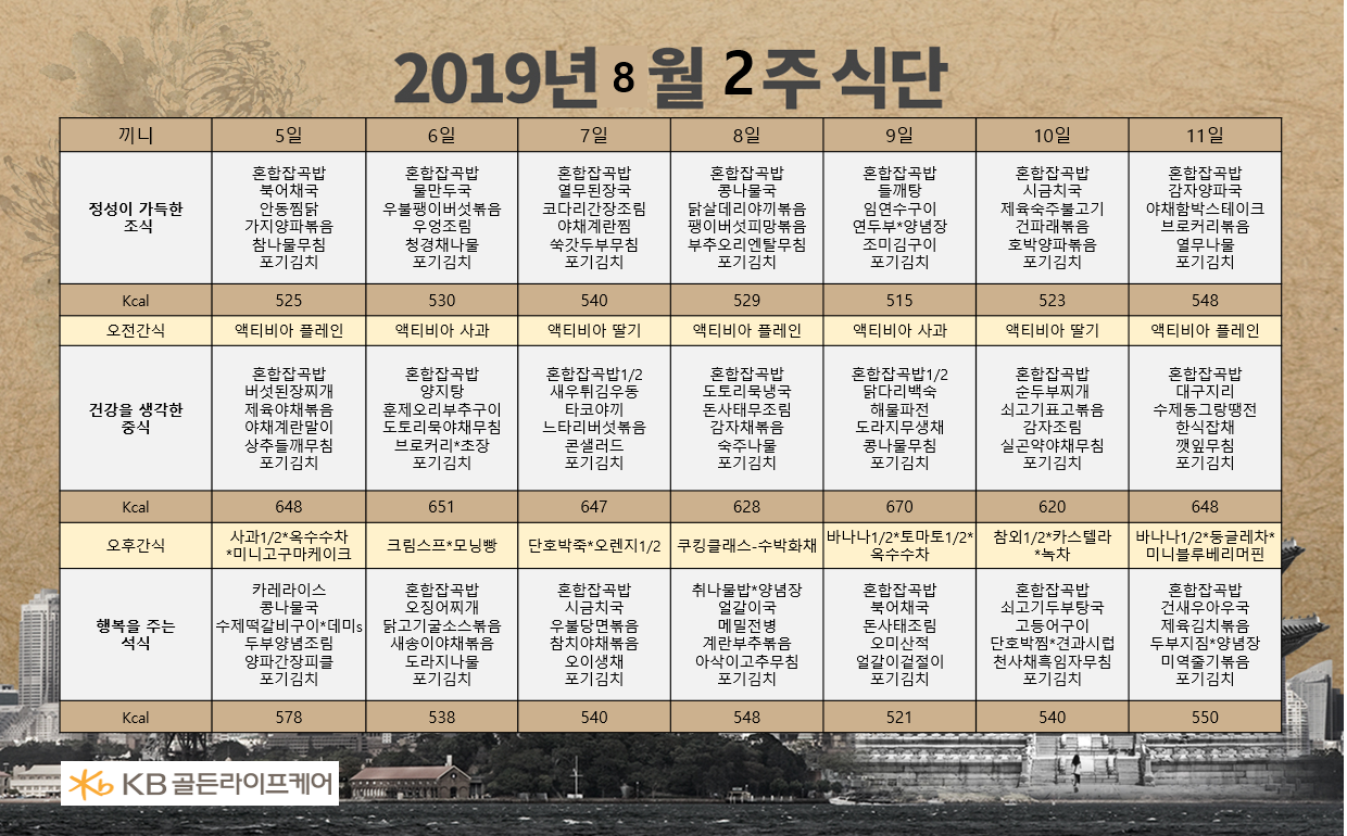 위례빌리지 [식단안내] 위례 빌리지 8월 2주차 식단표 페이지 정보 작성자 KB 골든라이프 댓글 0건 조회 2,644회 작성일 19-08-02 10:34 목록 본문 목록 이전글[식단안내] 위례 케어센터 8월 2주차 식단표 19.08.02 다음글[프로그램 안내] 2019년 위례케어센터 8월 프로그램 일정표 19.08.01