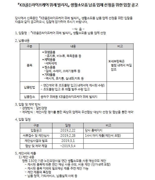 본사 『KB골든라이프케어 위례 빌리지』 생활소모품 납품 업체 선정을 위한 입찰 공고