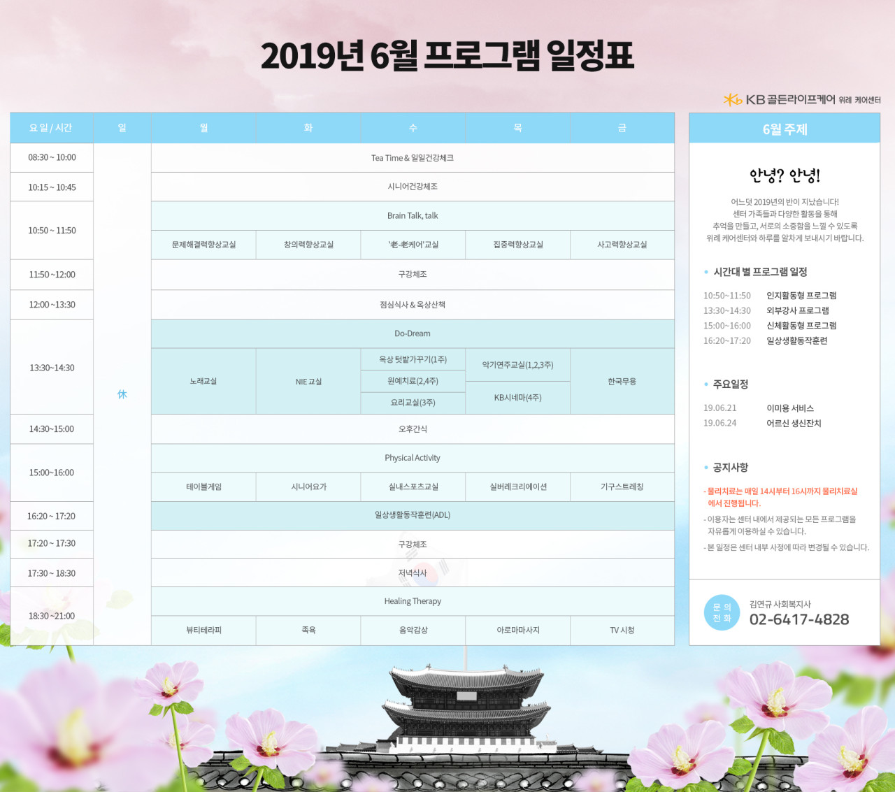위례케어센터 [프로그램 안내] 위례케어센터 2019년 6월 프로그램 스케줄 페이지 정보 작성자 KB 골든라이프 댓글 0건 조회 3,369회 작성일 19-06-11 16:19 목록 본문 목록 이전글[식단안내] 위례케어센터 2019년 6월 2주차 식단표 19.06.14 다음글[식단안내] 강동케어센터 2019년 6월 식단표 19.05.29