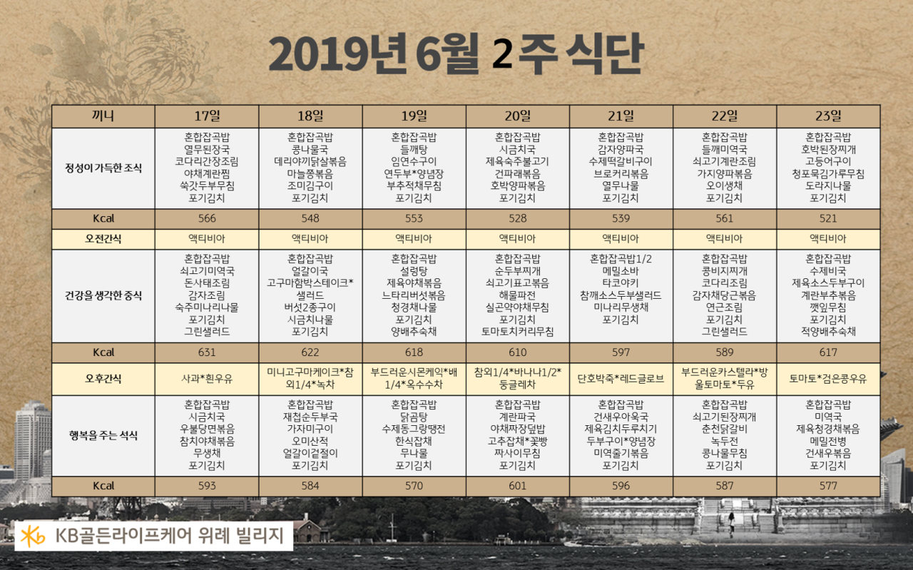 위례빌리지 [식단안내] 위례 빌리지 2019년 6월 2주차 식단표 페이지 정보 작성자 KB 골든라이프 댓글 0건 조회 3,834회 작성일 19-06-14 11:03 목록 본문 목록 이전글[프로그램 안내] 2019년 강동케어센터 7월 프로그램 스케줄 19.06.28 다음글[식단안내] 위례케어센터 2019년 6월 2주차 식단표 19.06.14