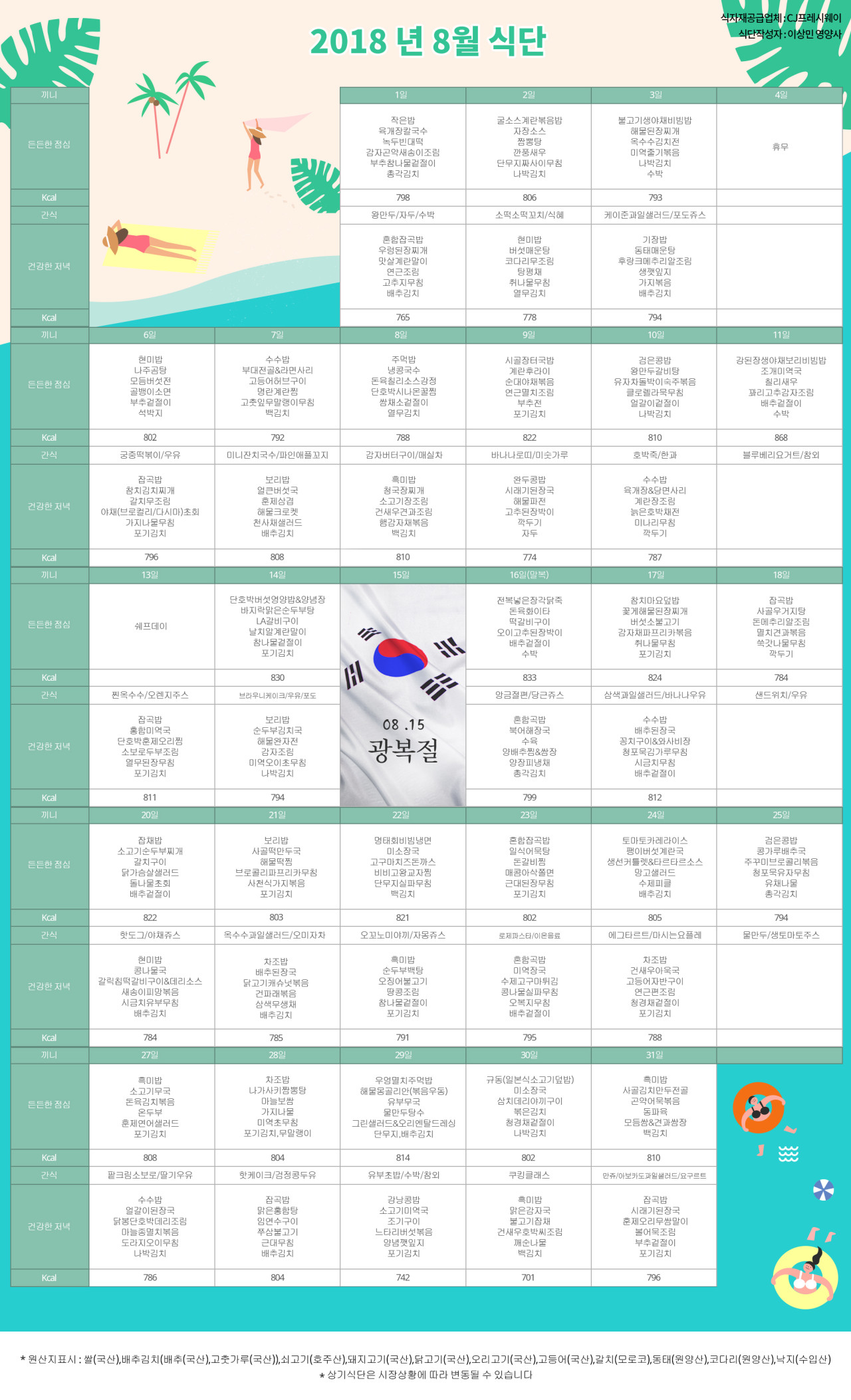 강동케어센터 [식단안내] 2018년 8월 식단표 페이지 정보 작성자 KB 골든라이프 댓글 0건 조회 4,069회 작성일 18-08-03 14:58 목록 본문 목록 이전글[프로그램 안내] 2018년 8월 프로그램 스케줄 18.08.03 다음글[프로그램 안내] 2018년 7월 프로그램 스케줄 18.07.02