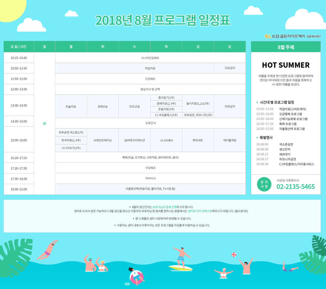 강동케어센터 [프로그램 안내] 2018년 8월 프로그램 스케줄 페이지 정보 작성자 KB 골든라이프 댓글 0건 조회 4,393회 작성일 18-08-03 14:59 목록 본문 목록 이전글[식단안내] 2018년 9월 식단표 18.09.04 다음글[식단안내] 2018년 8월 식단표 18.08.03
