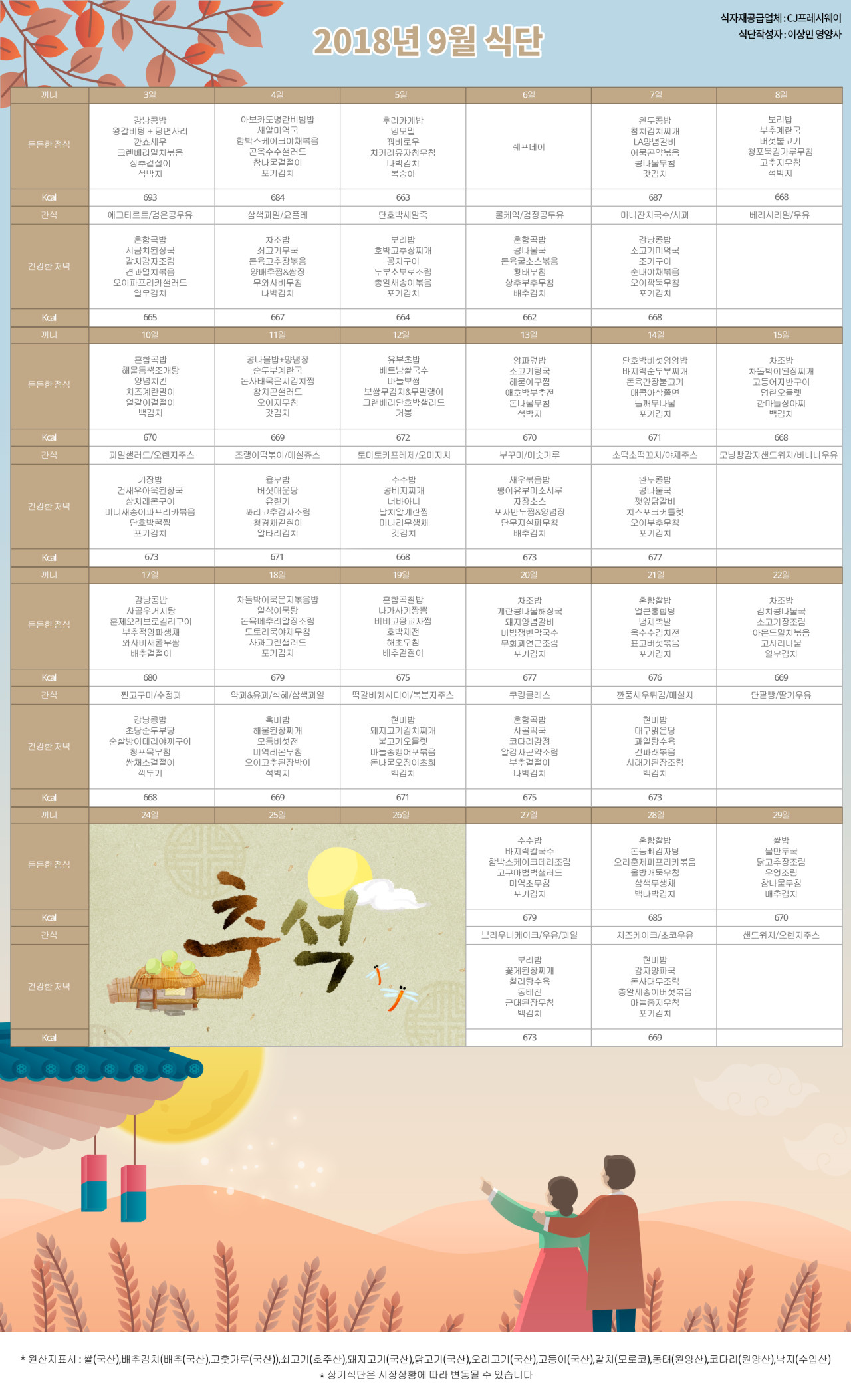 강동케어센터 [식단안내] 2018년 9월 식단표 페이지 정보 작성자 KB 골든라이프 댓글 0건 조회 4,535회 작성일 18-09-04 09:36 목록 본문 목록 이전글[프로그램 안내] 2018년 9월 프로그램 스케줄 18.09.04 다음글[프로그램 안내] 2018년 8월 프로그램 스케줄 18.08.03