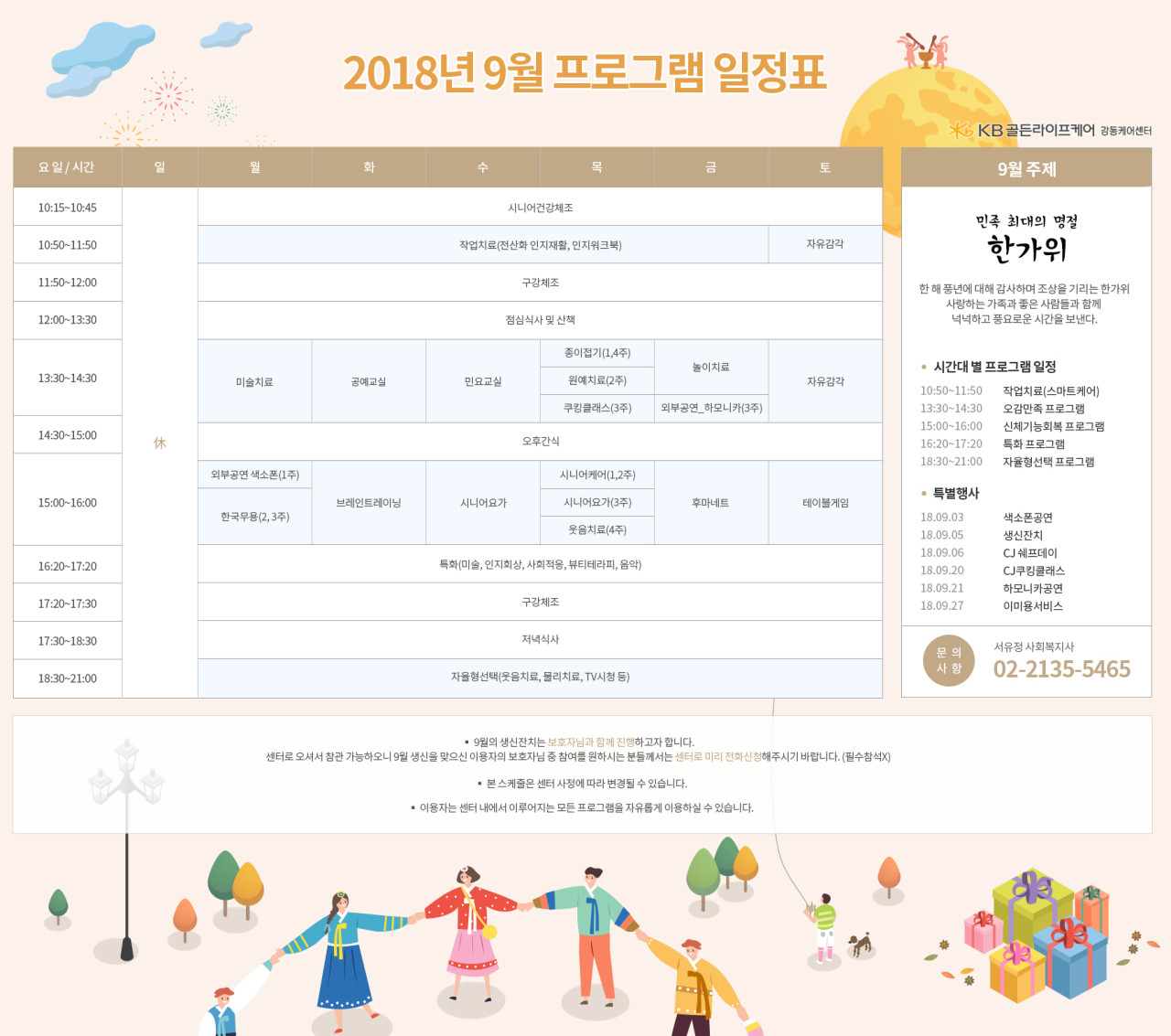 강동케어센터 [프로그램 안내] 2018년 9월 프로그램 스케줄 페이지 정보 작성자 KB 골든라이프 댓글 0건 조회 5,398회 작성일 18-09-04 09:38 목록 본문 목록 이전글[프로그램 안내] 2018년 10월 프로그램 스케줄 18.10.05 다음글[식단안내] 2018년 9월 식단표 18.09.04