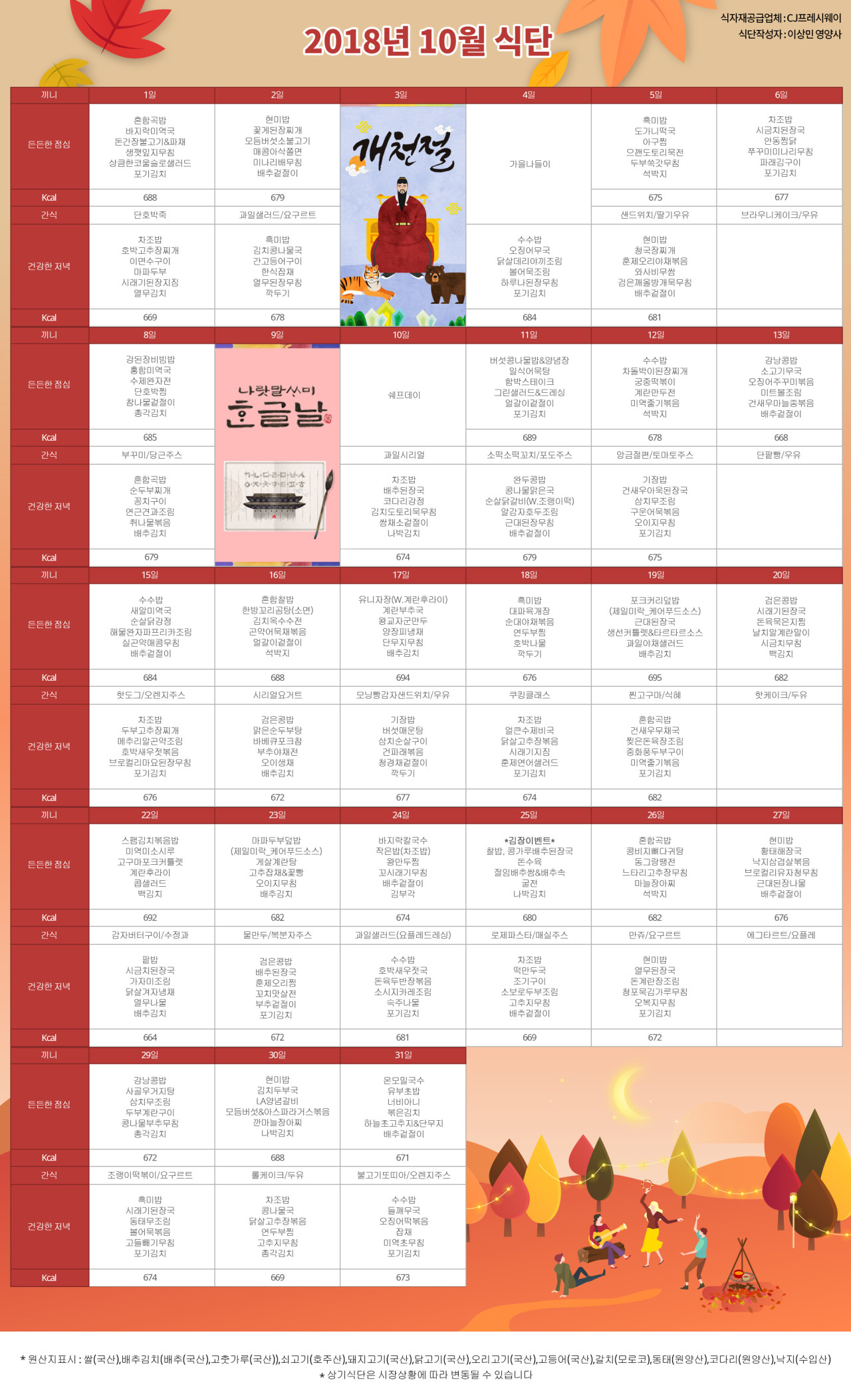 강동케어센터 [식단안내] 2018년 10월 식단표 페이지 정보 작성자 KB 골든라이프 댓글 0건 조회 5,055회 작성일 18-10-05 11:25 목록 본문 목록 이전글[식단안내] 2018년 11월 식단표 18.11.01 다음글[프로그램 안내] 2018년 10월 프로그램 스케줄 18.10.05