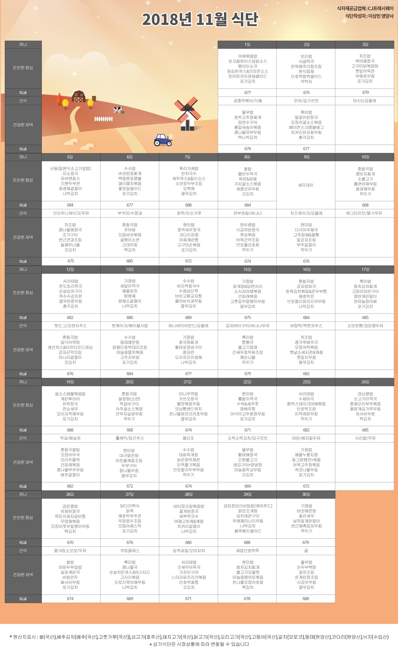 강동케어센터 [식단안내] 2018년 11월 식단표 페이지 정보 작성자 KB 골든라이프 댓글 0건 조회 3,832회 작성일 18-11-01 18:55 목록 본문 목록 이전글[프로그램 안내] 2018년 11월 프로그램 스케줄 18.11.01 다음글[식단안내] 2018년 10월 식단표 18.10.05