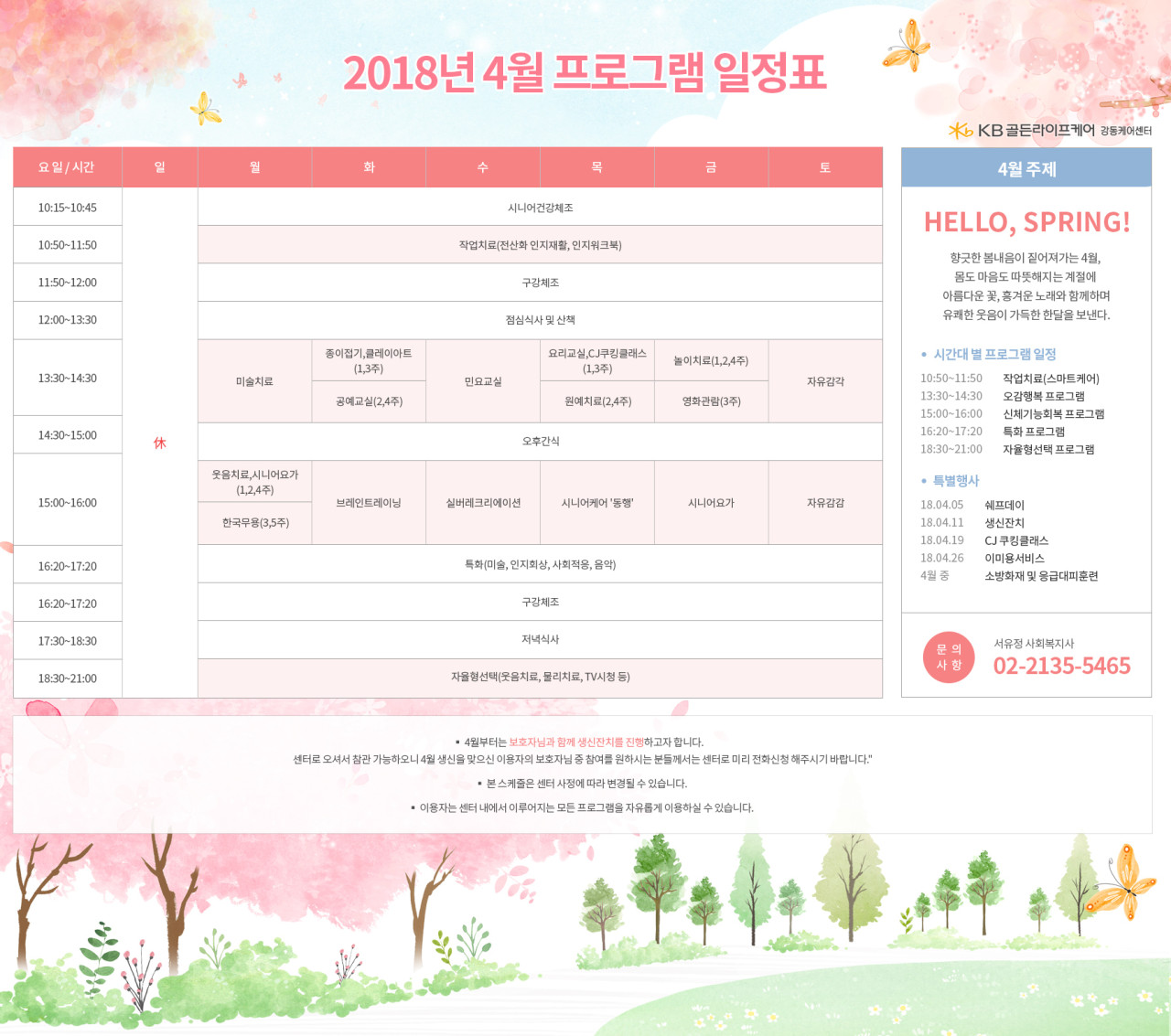 강동케어센터 [프로그램 안내] 2018년 4월 프로그램 스케줄 페이지 정보 작성자 KB 골든라이프 댓글 0건 조회 3,136회 작성일 18-04-03 17:01 목록 본문 목록 이전글[식단안내] 2018년 4월 봄맞이 식단 18.04.03 다음글[재무공시]제2기 재무상태표 18.03.30