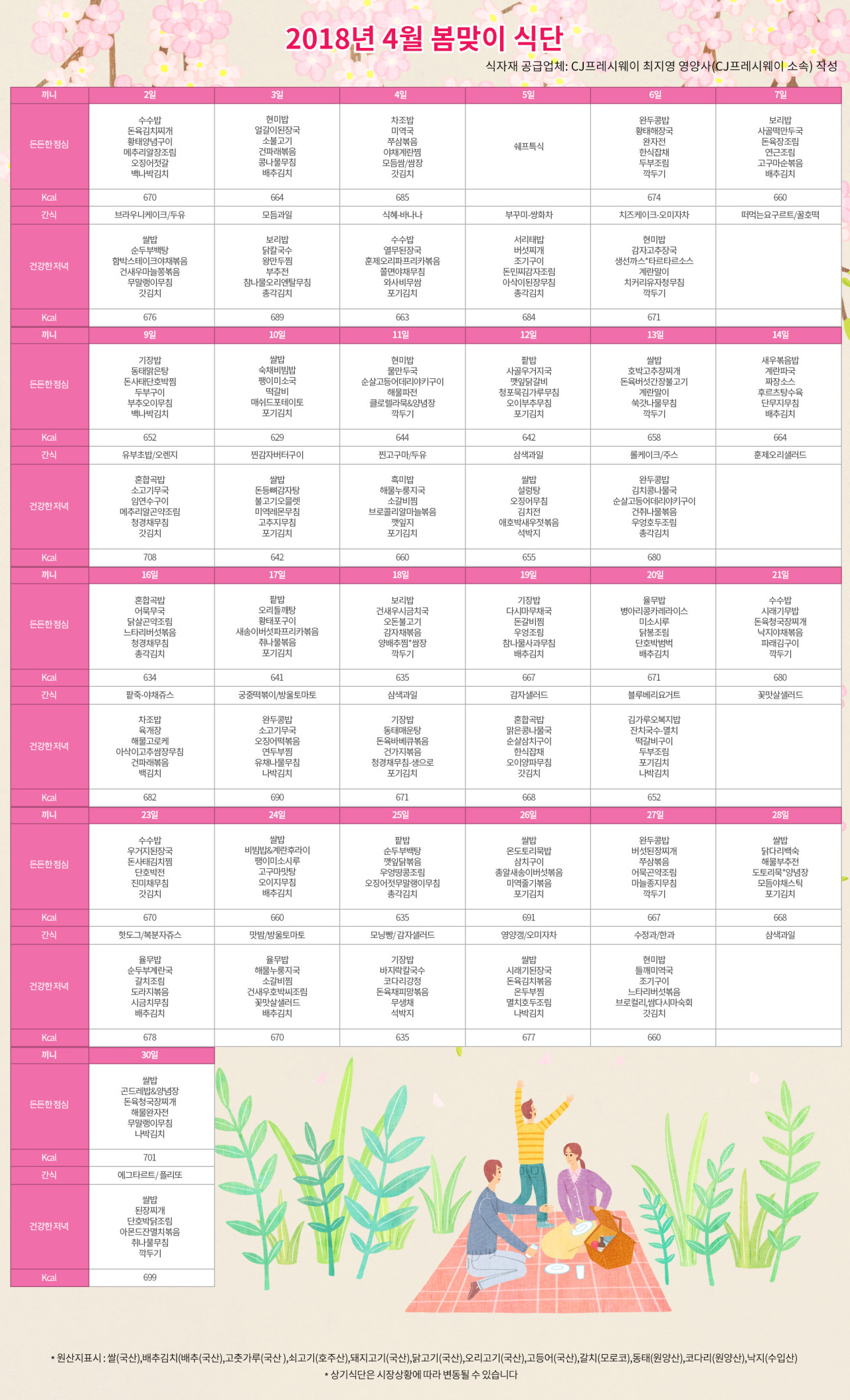 강동케어센터 [식단안내] 2018년 4월 봄맞이 식단 페이지 정보 작성자 KB 골든라이프 댓글 0건 조회 3,240회 작성일 18-04-03 17:05 목록 본문 목록 이전글[식단안내] 2018년 5월 가정의 달 식단 18.05.02 다음글[프로그램 안내] 2018년 4월 프로그램 스케줄 18.04.03