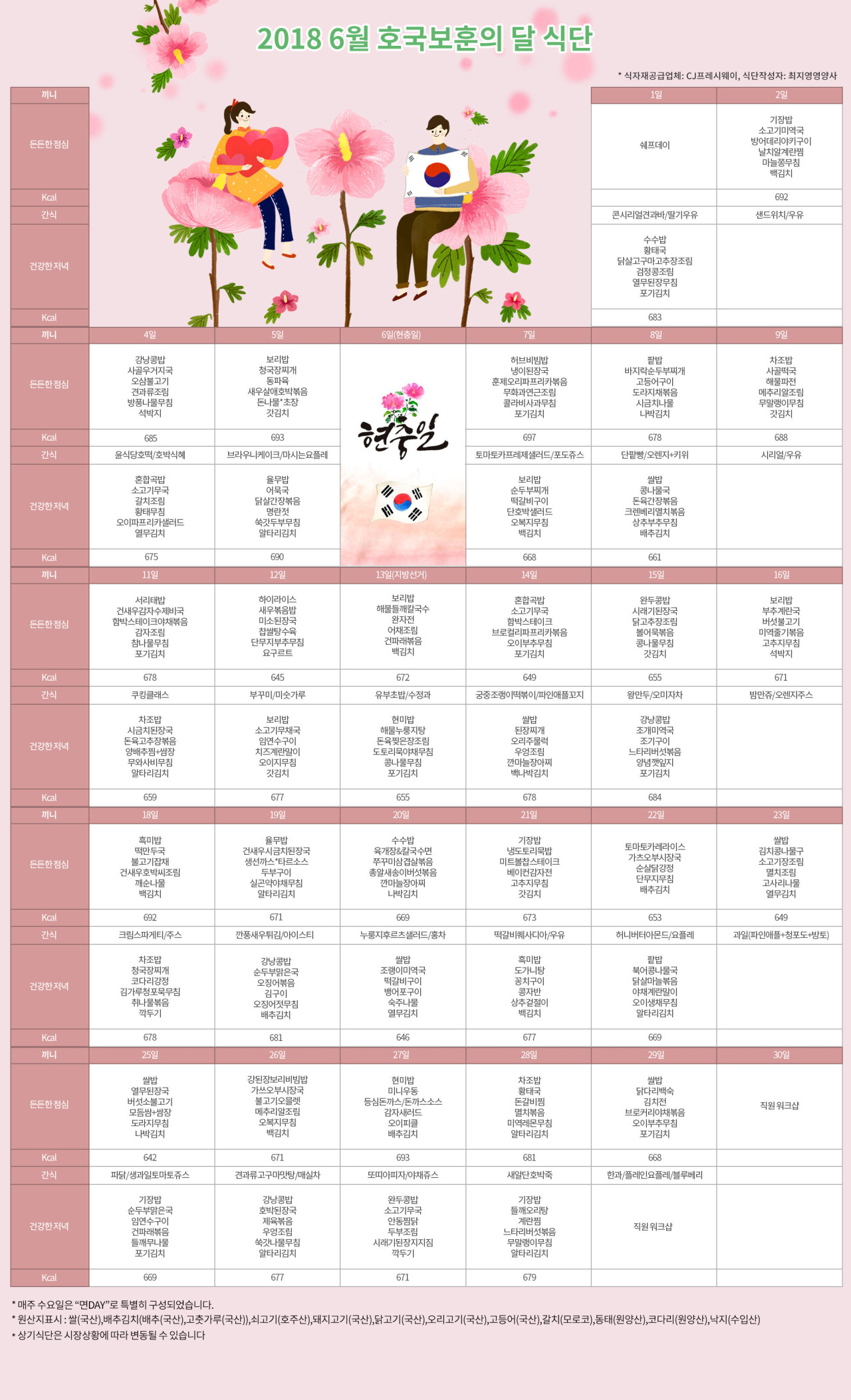강동케어센터 [식단안내] 2018년 6월 호국보훈의 달 식단 페이지 정보 작성자 KB 골든라이프 댓글 0건 조회 3,149회 작성일 18-06-06 12:43 목록 본문 목록 이전글[식단안내] 2018년 7월 식단표 18.07.02 다음글[프로그램 안내] 2018년 6월 프로그램 스케줄 18.06.06