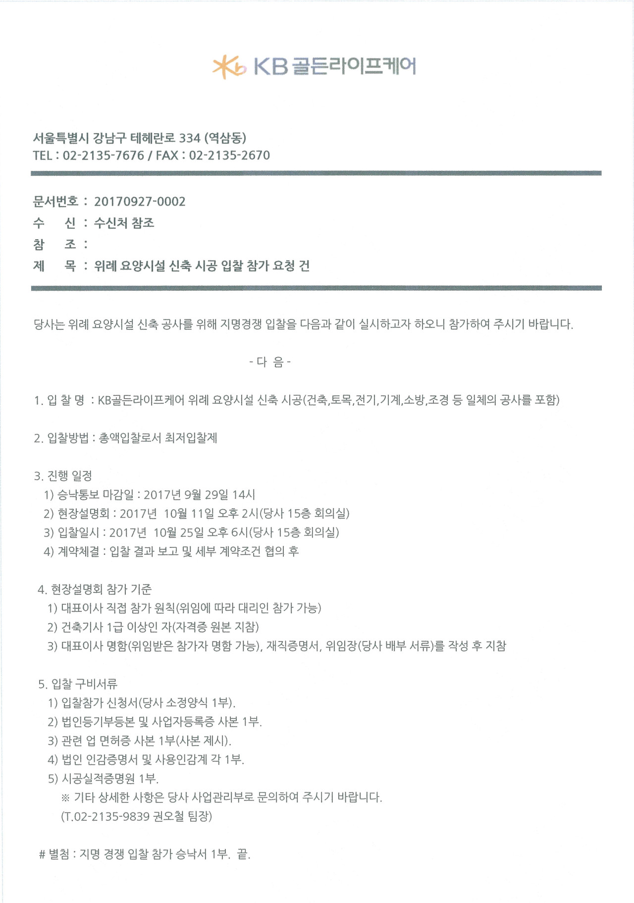 본사 [공고] KB골든라이프케어 위례 요양시설 신축 시공 입찰공고