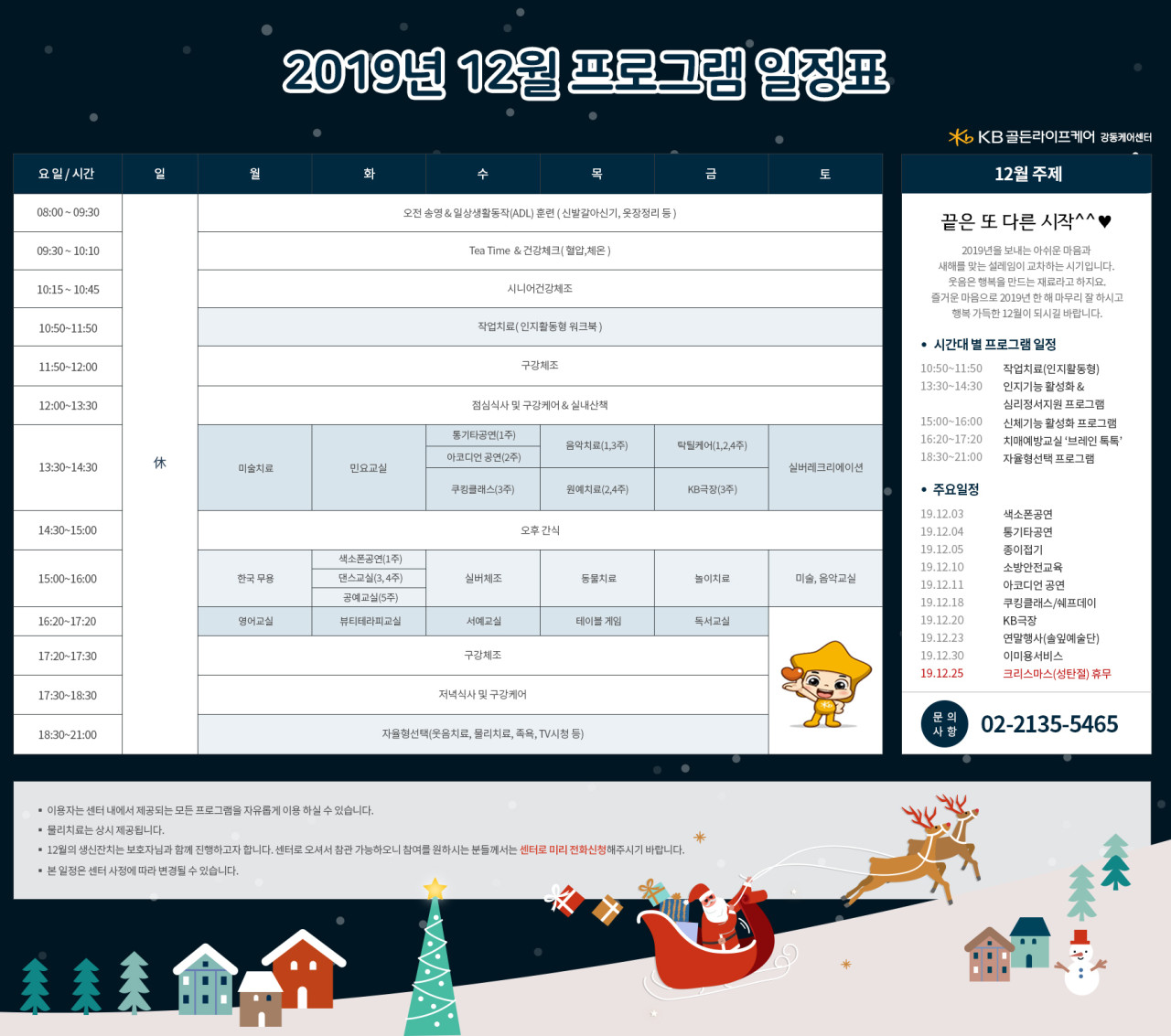 강동케어센터 [프로그램 안내] 2019년 강동케어센터 12월 프로그램 일정표 페이지 정보 작성자 KB 골든라이프 댓글 0건 조회 5,324회 작성일 19-12-10 09:33 목록 본문 목록 이전글[식단안내] 강동케어센터 2019년 12월 식단표 19.12.10 다음글[식단안내] 위례 데이케어 11월 2주차 식단표 19.12.06
