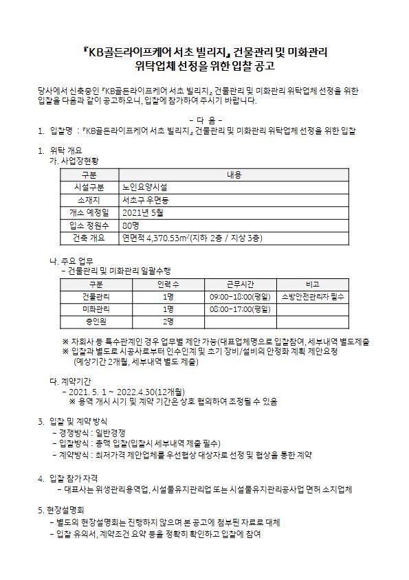 본사 『KB골든라이프케어 서초 빌리지』 건물관리 및 미화관리 위탁업체 선정을 위한 입찰 공고