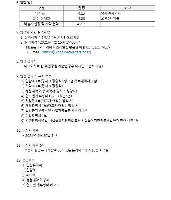 - 이전글『KB골든라이프케어 서초 빌리지』 건물관리 및 미화관리 위탁업체 선정을 위한 입찰 공고(재공고) 21.04.21