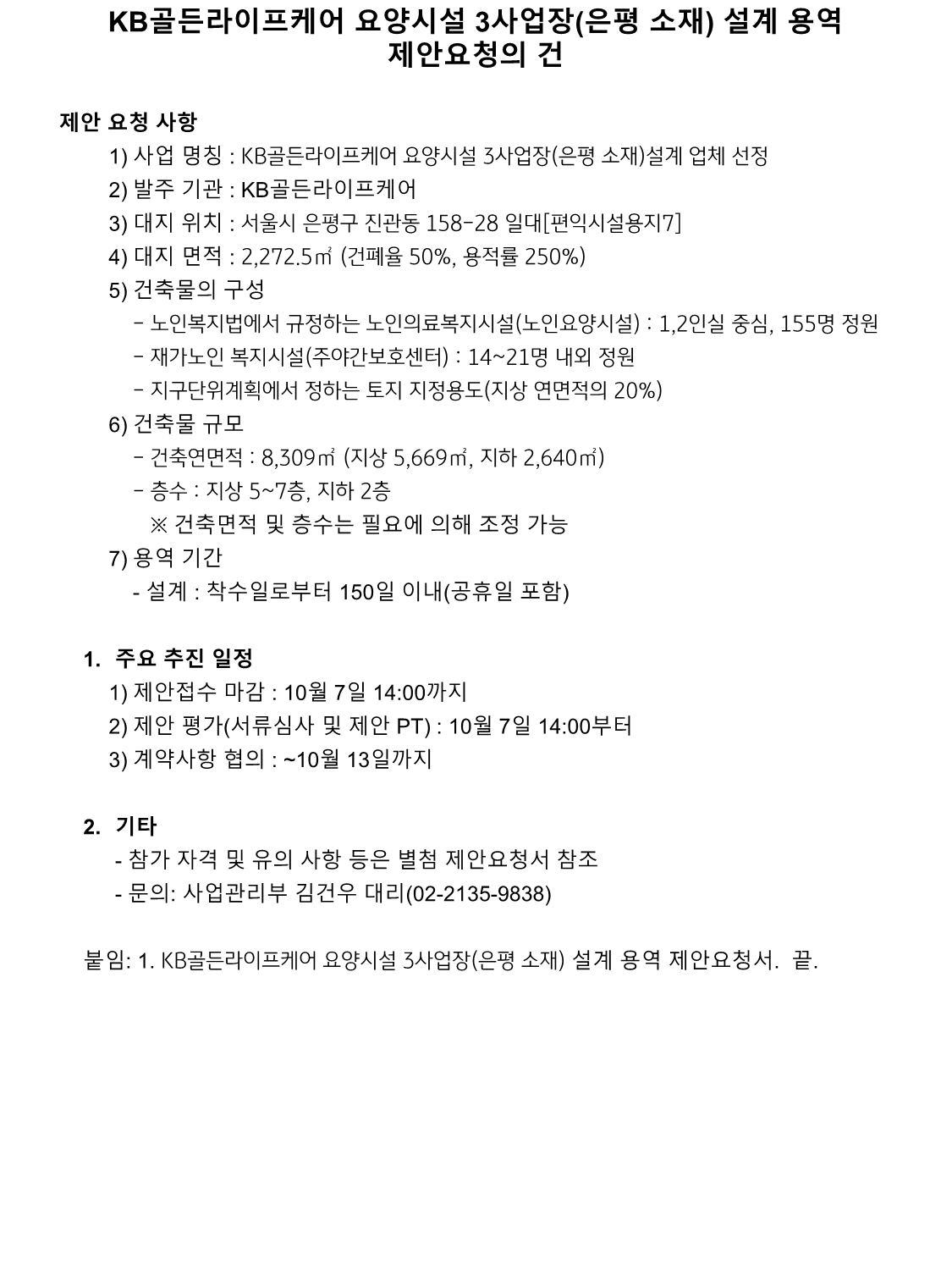 본사 [공고]KB골든라이프케어 요양시설 3사업장(은평 소재) 설계 용역 제안요청