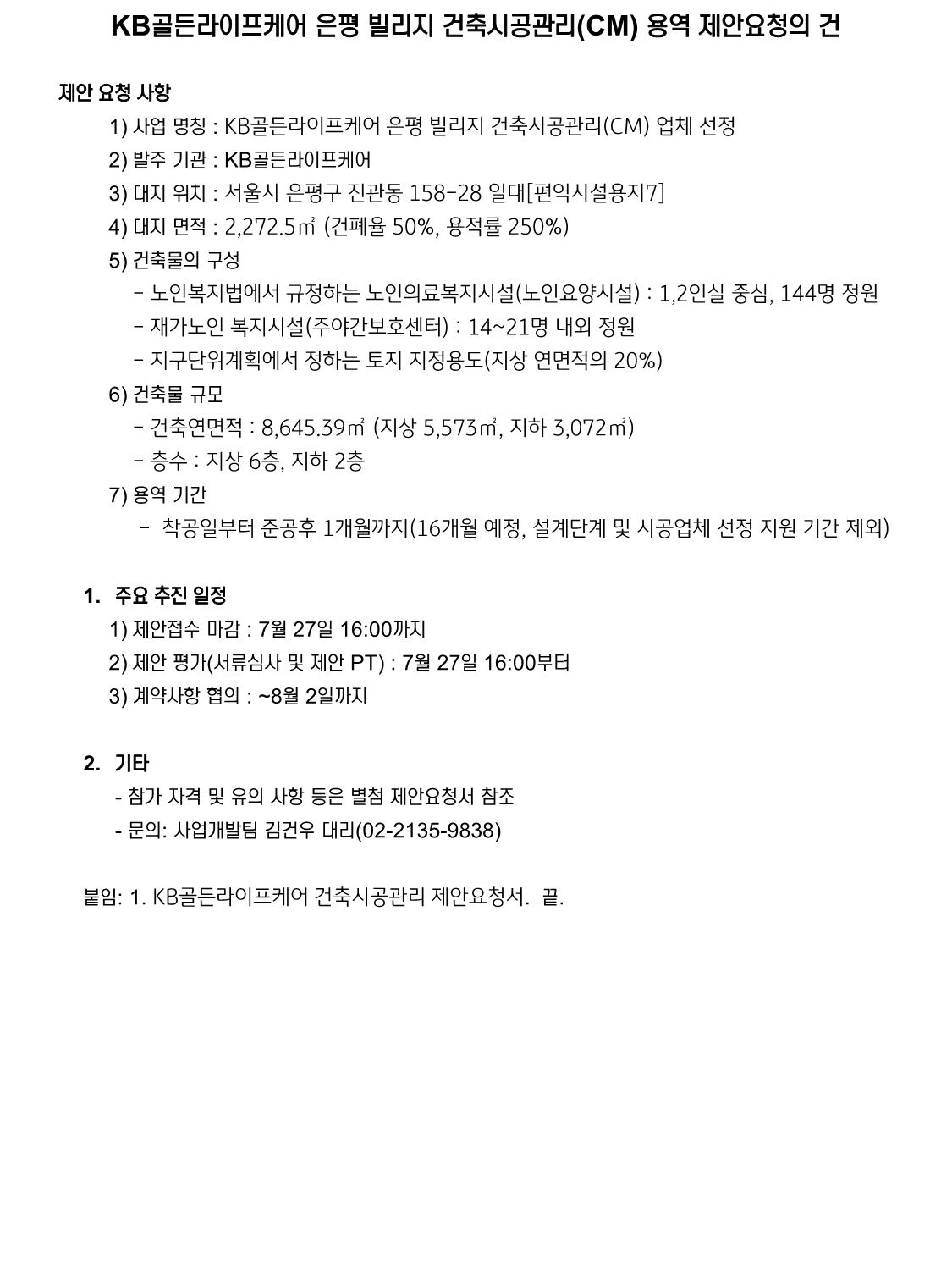 본사 [공고]KB골든라이프케어 은평 빌리지 건축시공관리(CM) 용역 제안요청