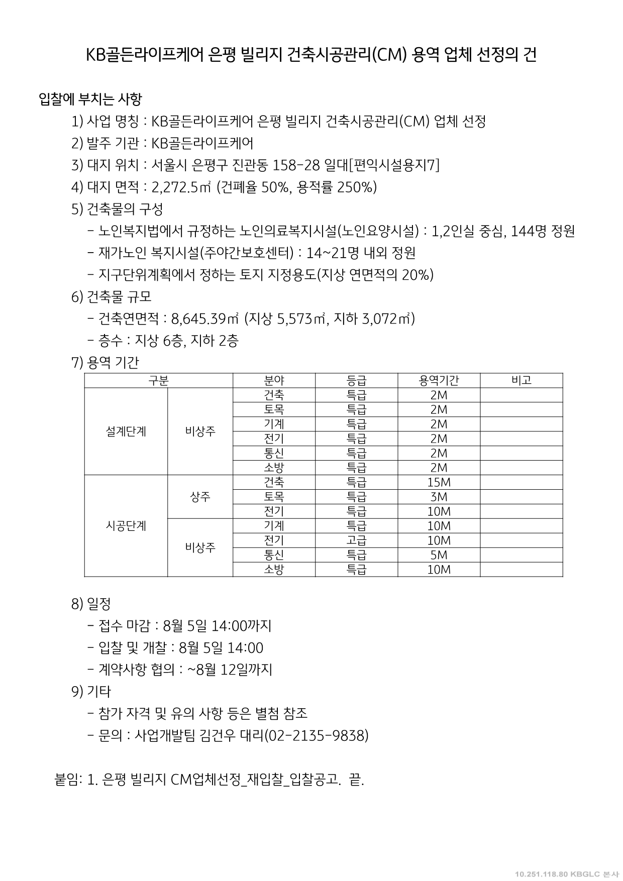 본사 KB골든라이프케어 은평 빌리지 건축시공관리(CM) 용역 업체 선정 공고(재입찰)