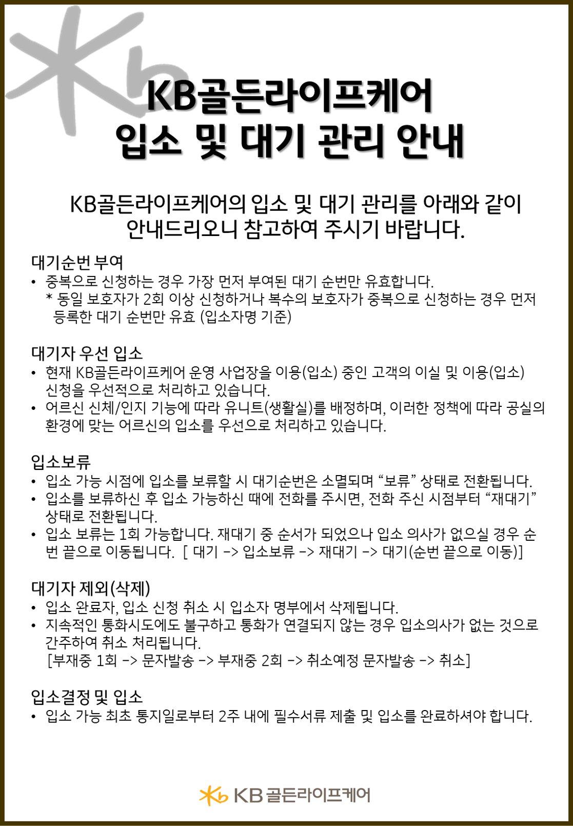본사 KB골든라이프케어 입소 및 대기 관리 안내 페이지 정보 작성자 KB 골든라이프케어 댓글 0건 조회 8,155회 작성일 23-01-26 10:07 목록 본문 KB골든라이프케어 입소 및 대기 관리 안내입니다. KB골든라이프케어 사업장에 대기해주시는 모든 고객님들께 감사드리며, 아래의 안내문을 참고해주시기 바랍니다. [입소 및 대기관련 문의] - 서초 빌리지 : 02-1670- 4710 - 위례 빌리지 : 02-1670- 4720 - 본사 운영관리팀 : 02-2135-2681 목록 이전글[언론] 싱글리스트 - 스타트업·중기, 뉴테크놀로지 앞세워 '실버케어 시장' 개척 경쟁 23.01.26 다음글KB골든라이프케어 은평 빌리지 건축시공관리(CM) 용역 업체 선정 공고(재입찰) 22.07.29