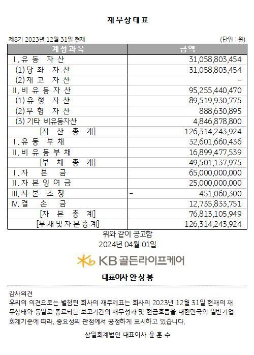 [재무공시] 제8기 재무상태표 페이지 정보 작성자 KB 골든라이프케어 댓글 0건 조회 693회 작성일 24-04-01 12:49 목록 본문 목록 이전글KB골든라이프케어 비즈니스 제휴 24.04.17 다음글KB골든라이프케어 강동빌리지 건축시공관리(CM) 용역 입찰 공고 24.01.29