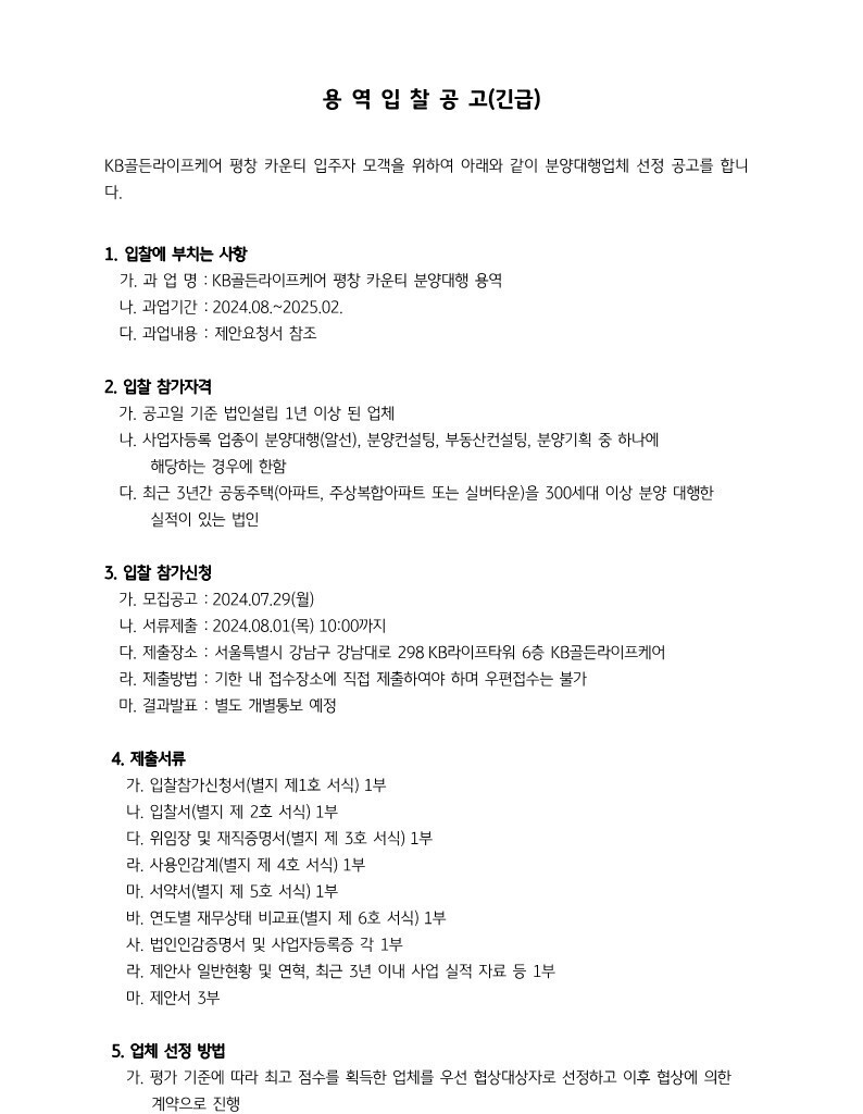 본사 KB골든라이프케어 평창 카운티 분양 대행 용역 입찰 공고