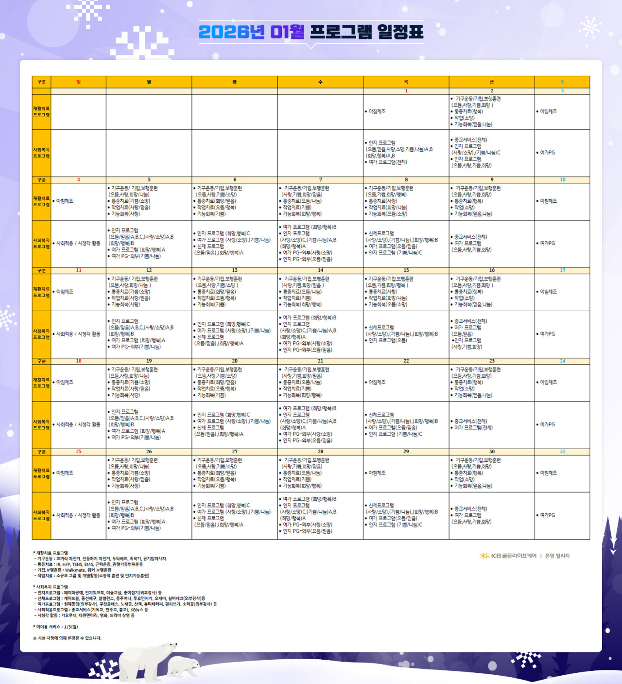 은평빌리지 [프로그램 안내]2026년 은평빌리지 1월 프로그램 일정표 페이지 정보 작성자 최고관리자 댓글 0건 조회 627회 작성일 25-12-31 13:08 목록 본문 . 목록 이전글[프로그램 안내] 2026년 서초 빌리지 1월 프로그램 일정표 25.12.31 다음글[식단안내] 2025년 12월 5주 식단표 25.12.30