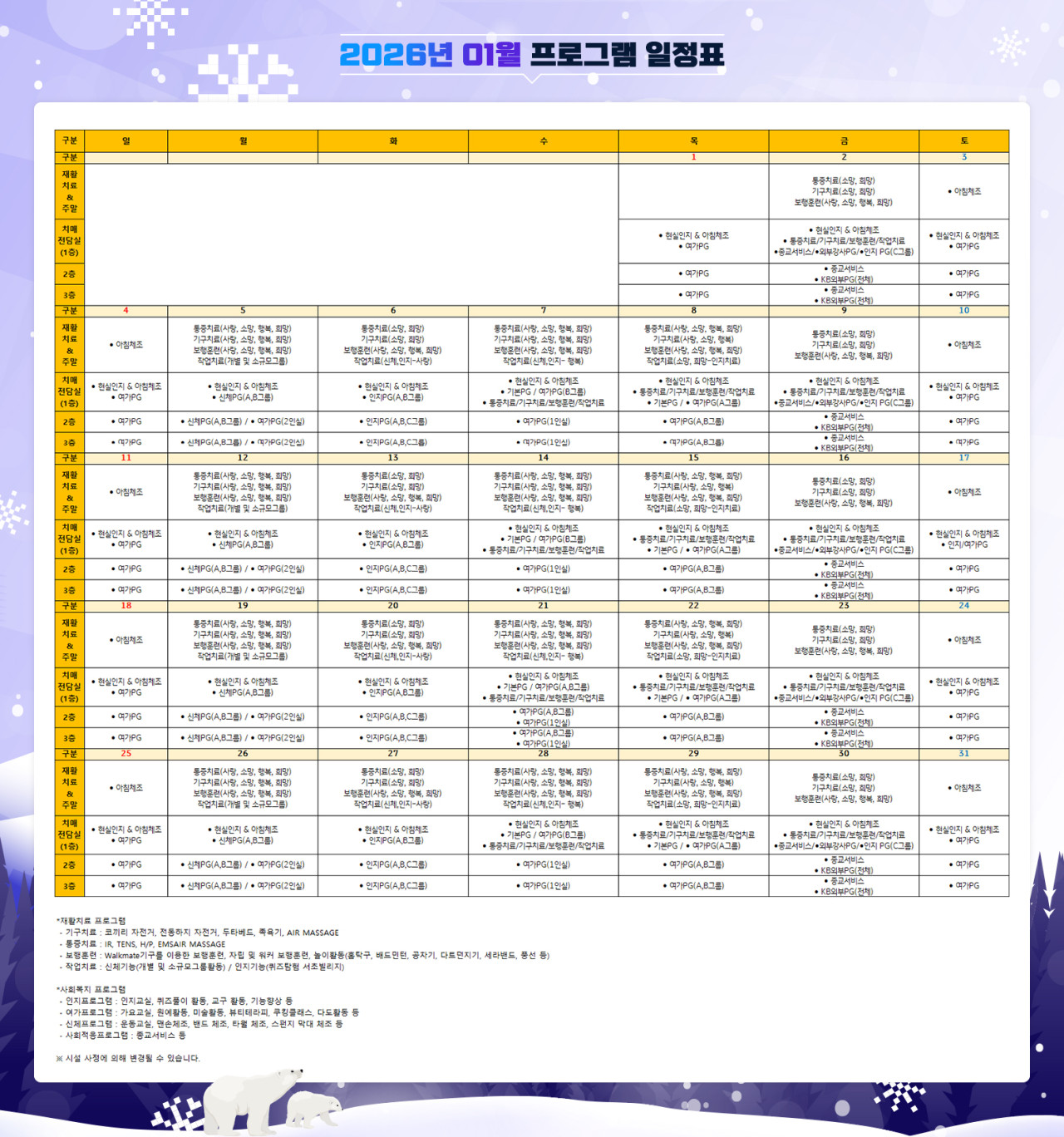 서초빌리지 [프로그램 안내] 2026년 서초 빌리지 1월 프로그램 일정표 페이지 정보 작성자 최고관리자 댓글 0건 조회 732회 작성일 25-12-31 13:58 목록 본문 목록 이전글[프로그램 안내] 2026년 강동케어센터 1월 프로그램 일정표 25.12.31 다음글[프로그램 안내]2026년 은평빌리지 1월 프로그램 일정표 25.12.31