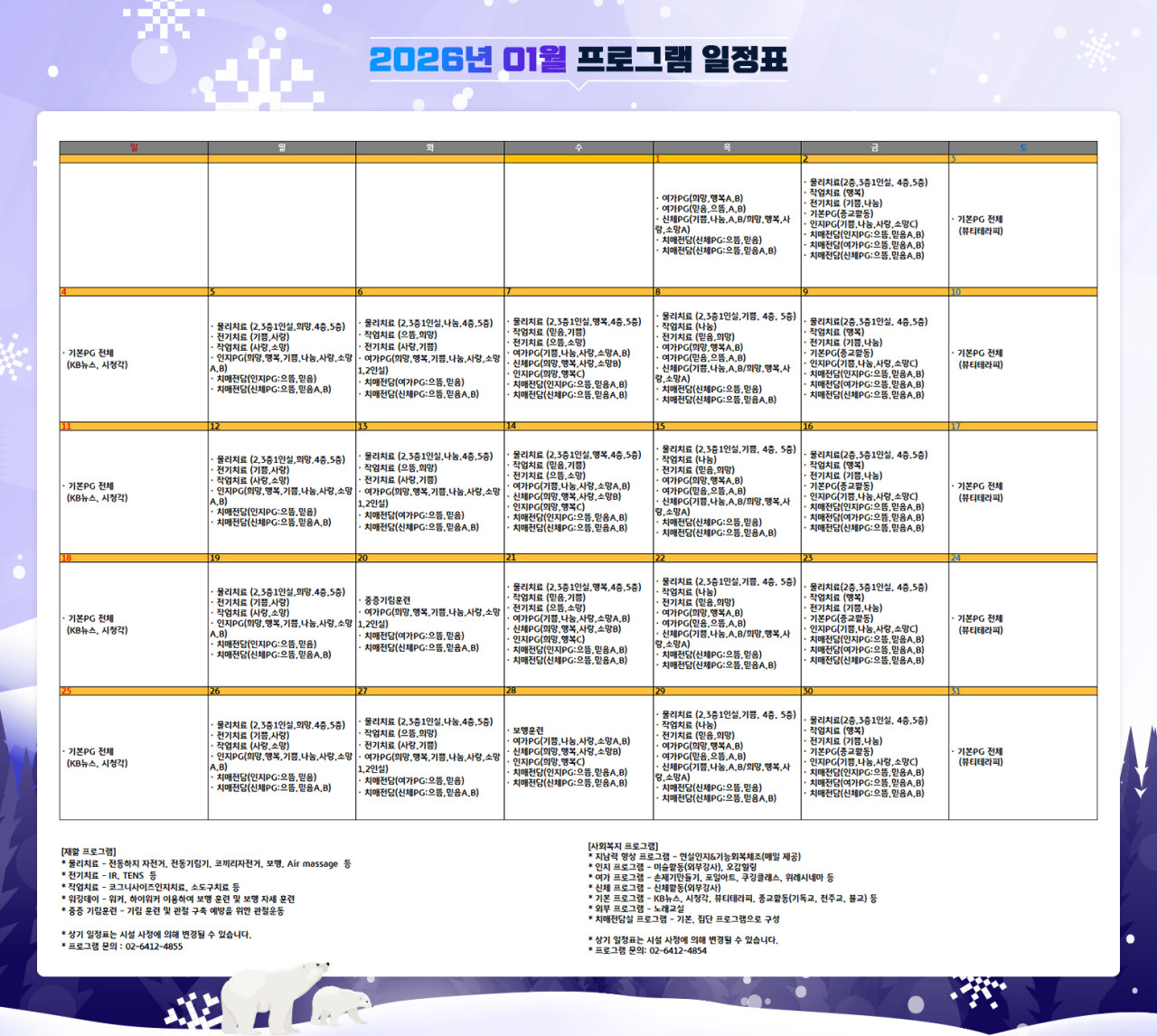 위례빌리지 [프로그램안내] 2026년 위례 빌리지 1월 프로그램 일정표 페이지 정보 작성자 최고관리자 댓글 0건 조회 739회 작성일 25-12-31 17:29 목록 본문 목록 이전글[하루의식단] 2025년 12월 31일 중식및 석식 25.12.31 다음글[프로그램 안내] 2026년 강동케어센터 1월 프로그램 일정표 25.12.31