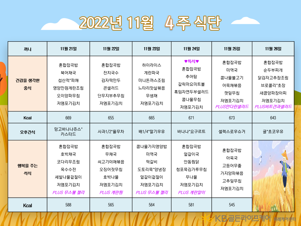 위례케어센터 [식단안내] 위례 케어센터 11월 4주차 식단표 페이지 정보 작성자 KB 골든라이프케어 댓글 0건 조회 2,511회 작성일 22-11-17 17:09 목록 본문 목록 이전글[오늘의 식단] 2022년 11월 21일 화요일 22.11.21 다음글[식단안내] 위례 빌리지 11월 4주차 식단표 22.11.17