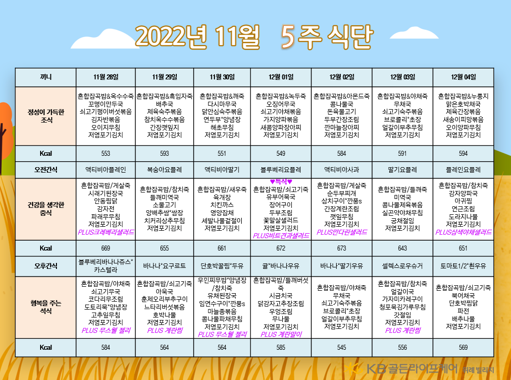 위례빌리지 [식단안내] 위례 빌리지 11월 5주차 식단표 페이지 정보 작성자 KB 골든라이프케어 댓글 0건 조회 2,461회 작성일 22-11-24 15:32 목록 본문 목록 이전글[식단안내] 위례 케어센터 11월 5주차 식단표 22.11.24 다음글[오늘의 식단] 2022년 11월 24일 목요일 22.11.24
