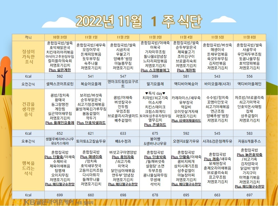 서초빌리지 [식단안내] 서초 빌리지 11월 1주차 식단표 페이지 정보 작성자 KB 골든라이프케어 댓글 0건 조회 2,563회 작성일 22-10-28 14:42 목록 본문 목록 이전글[ 오늘의 식단 ] 2022년 10월 28일 금요일 22.10.31 다음글[프로그램 안내] 2022년 위례케어센터 11월 프로그램 일정표 22.10.28