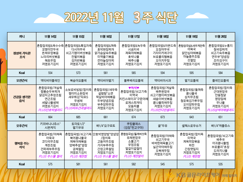 위례빌리지 [식단안내] 위례 빌리지 11월 3주차 식단표 페이지 정보 작성자 KB 골든라이프케어 댓글 0건 조회 2,442회 작성일 22-11-11 11:07 목록 본문 목록 이전글[식단안내] 위례 케어센터 11월 3주차 식단표 22.11.11 다음글[ 오늘의 식단 ] 2022년 11월 9일 수요일 22.11.09
