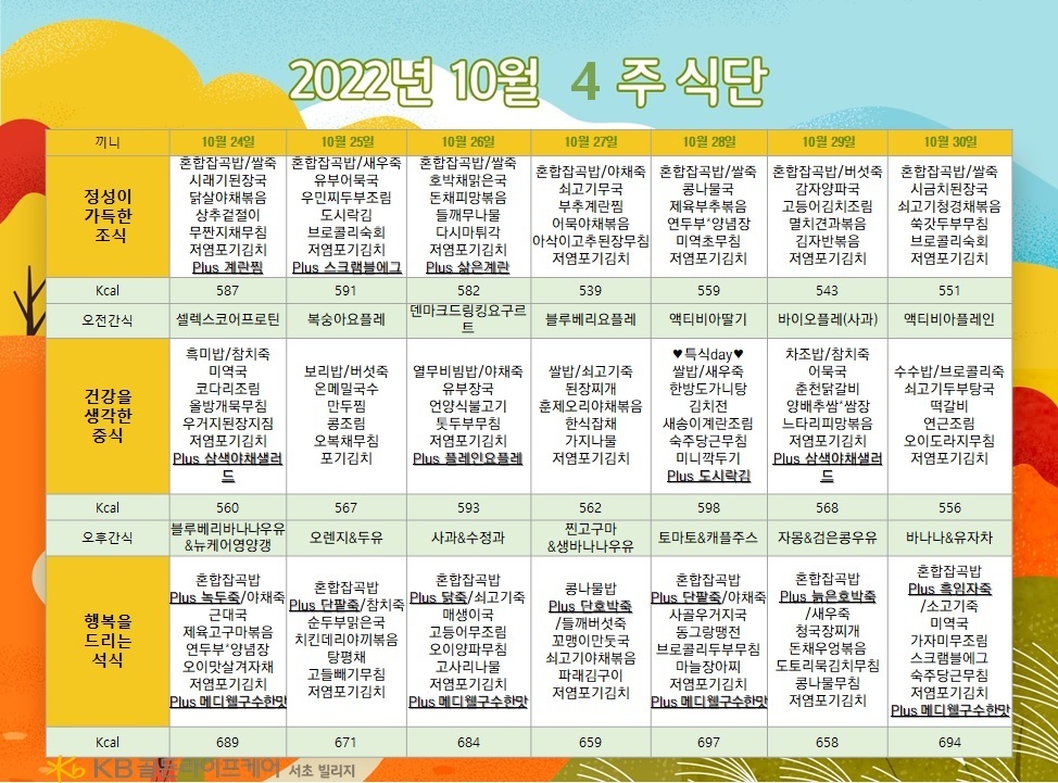 서초빌리지 [식단안내] 서초 빌리지 10월 4주차 식단표 페이지 정보 작성자 KB 골든라이프케어 댓글 0건 조회 2,539회 작성일 22-10-21 12:39 목록 본문 목록 이전글[프로그램안내] 2022년 서초 빌리지 11월 프로그램 일정표 22.10.25 다음글[ 오늘의 식단 ] 2022년 10월 20일 목요일 22.10.20