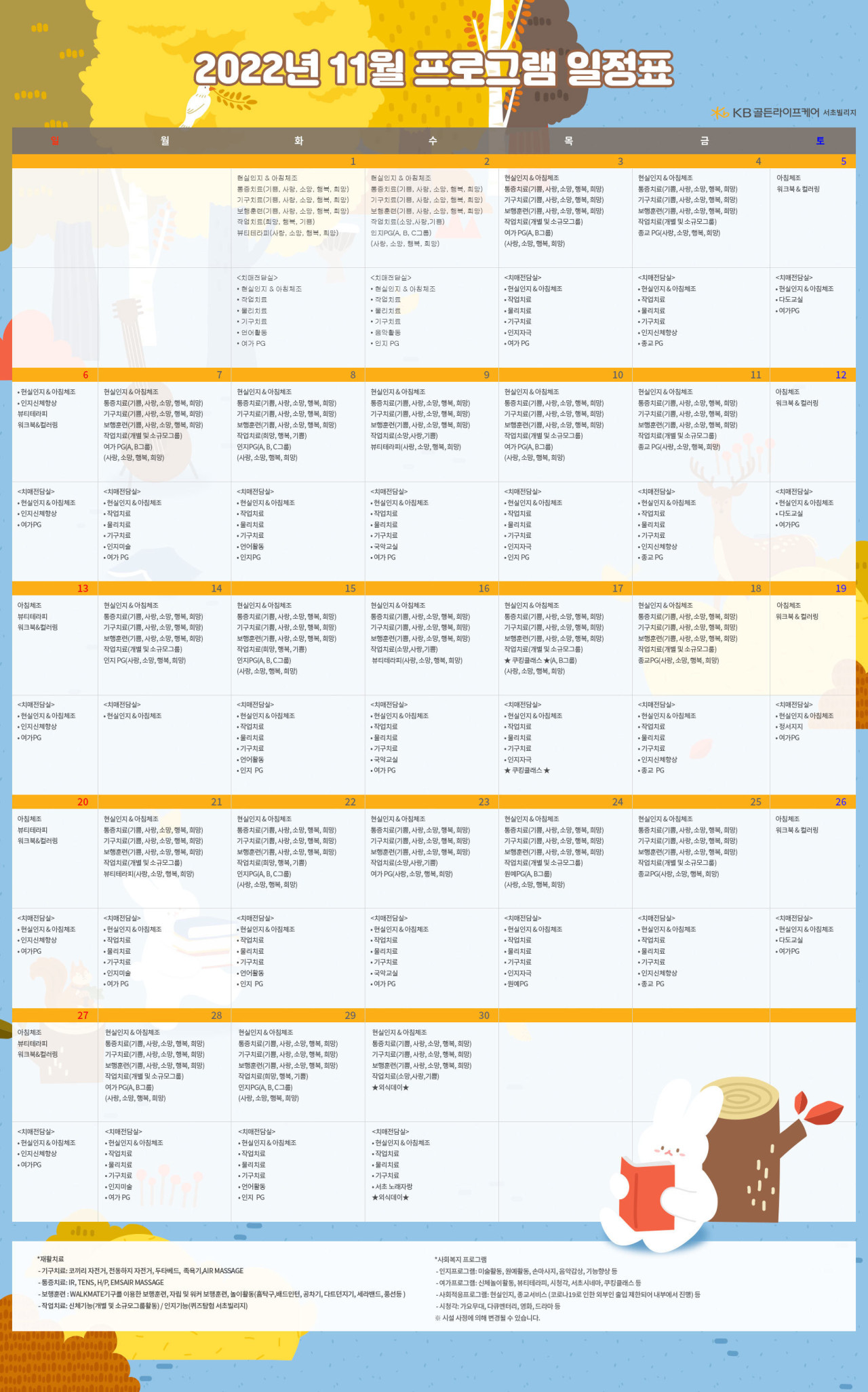 서초빌리지 [프로그램안내] 2022년 서초 빌리지 11월 프로그램 일정표 페이지 정보 작성자 KB 골든라이프케어 댓글 0건 조회 3,322회 작성일 22-10-25 09:00 목록 본문 목록 이전글[프로그램 안내] 2022년 위례 빌리지 11월 프로그램 일정표 22.10.25 다음글[식단안내] 서초 빌리지 10월 4주차 식단표 22.10.21
