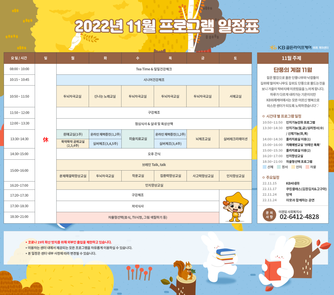 위례케어센터 [프로그램 안내] 2022년 위례케어센터 11월 프로그램 일정표 페이지 정보 작성자 KB 골든라이프케어 댓글 0건 조회 3,644회 작성일 22-10-28 09:21 목록 본문 목록 이전글[식단안내] 서초 빌리지 11월 1주차 식단표 22.10.28 다음글[식단안내] 위례 케어센터 11월 1주차 식단표 22.10.27