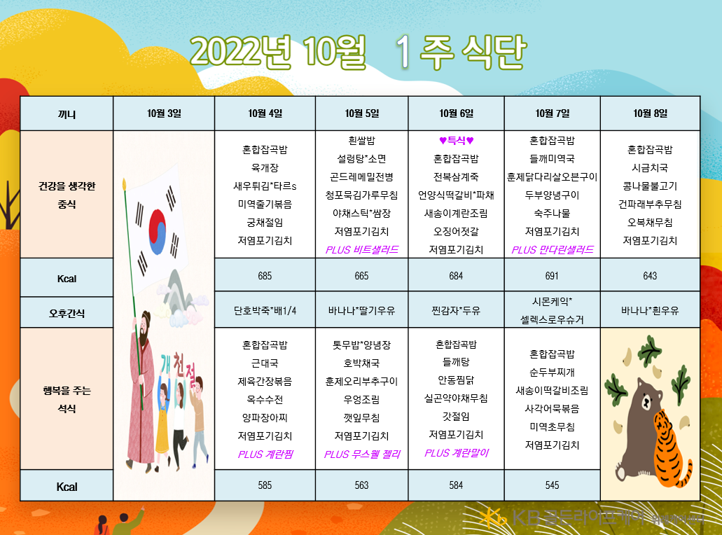 위례케어센터 [식단안내] 위례 케어센터 10월 1주차 식단표 페이지 정보 작성자 KB 골든라이프케어 댓글 0건 조회 2,691회 작성일 22-09-29 15:05 목록 본문 목록 이전글[ 오늘의 식단 ] 2022년 9월29일 목요일 22.09.29 다음글[식단안내] 위례 빌리지 10월 1주차 식단표 22.09.29