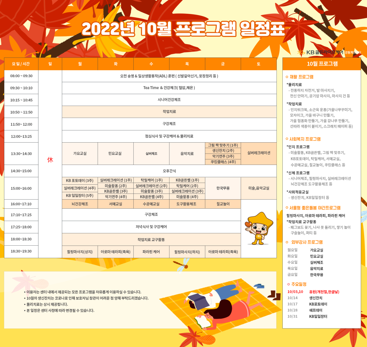 강동케어센터 [프로그램 안내] 2022년 강동케어센터 10월 프로그램 일정표 페이지 정보 작성자 KB 골든라이프케어 댓글 0건 조회 3,923회 작성일 22-09-30 08:50 목록 본문 목록 이전글[식단 안내] 2022년 강동케어센터 10월 식단표 22.09.30 다음글[ 오늘의 식단 ] 2022년 9월29일 목요일 22.09.29
