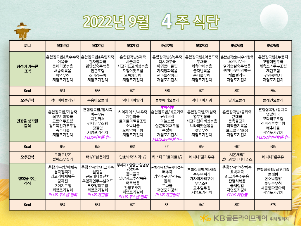 위례빌리지 [식단안내] 위례 빌리지 9월 4주차 식단표 페이지 정보 작성자 KB 골든라이프케어 댓글 0건 조회 2,399회 작성일 22-09-16 11:27 목록 본문 목록 이전글[식단안내] 위례 케어센터 9월 4주차 식단표 22.09.16 다음글[오늘의 식단] 2022년 9월 14일 수요일 22.09.14